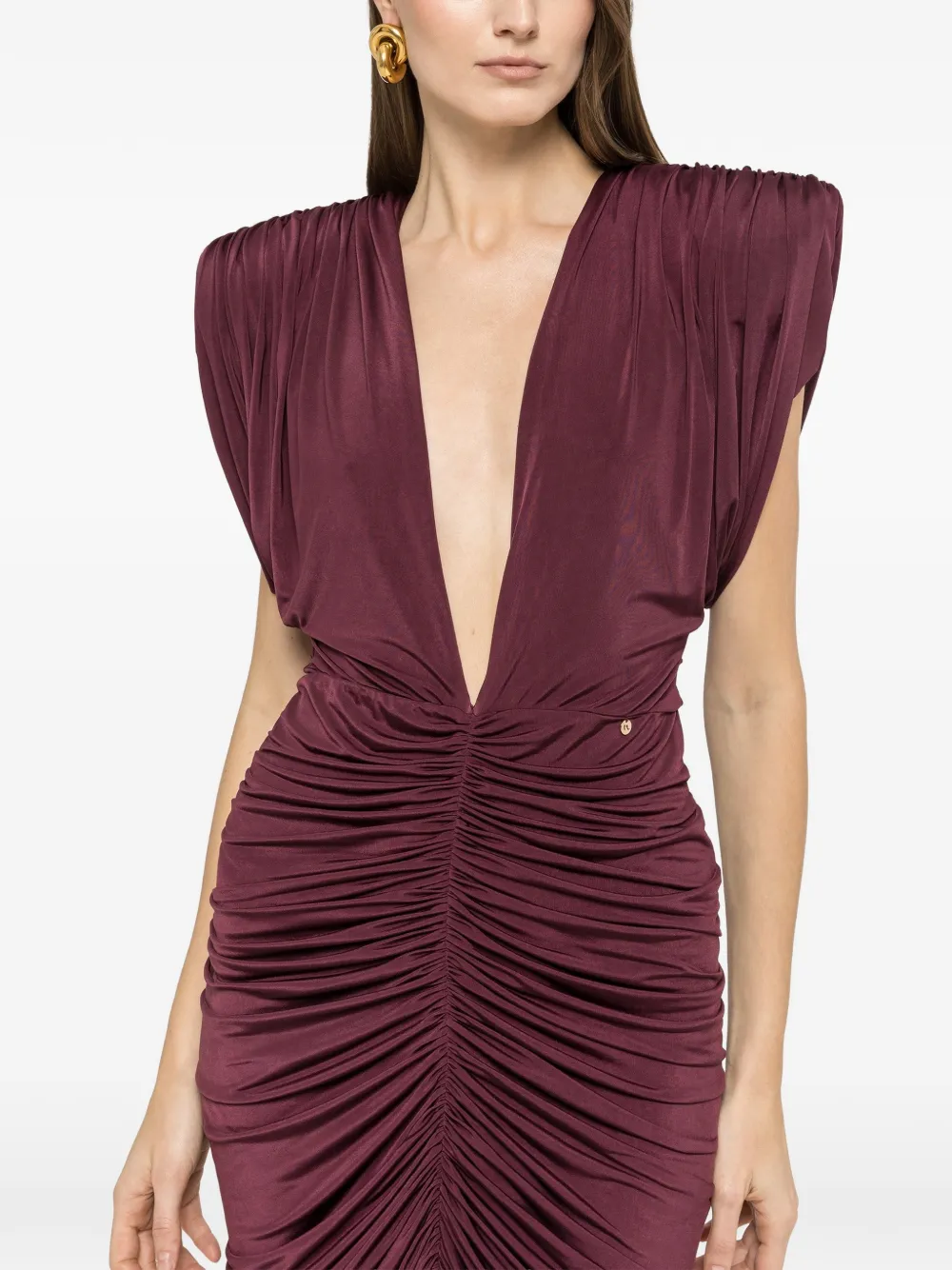 Темно-красное платье миди с V-образным вырезом, рукавами и сборкой, с логотипом