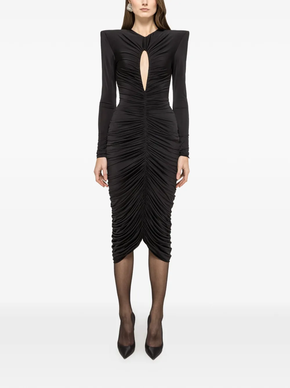 Черное платье с драпировкой, длинными рукавами, вырезом-капелькой, длиной миди и подплечниками