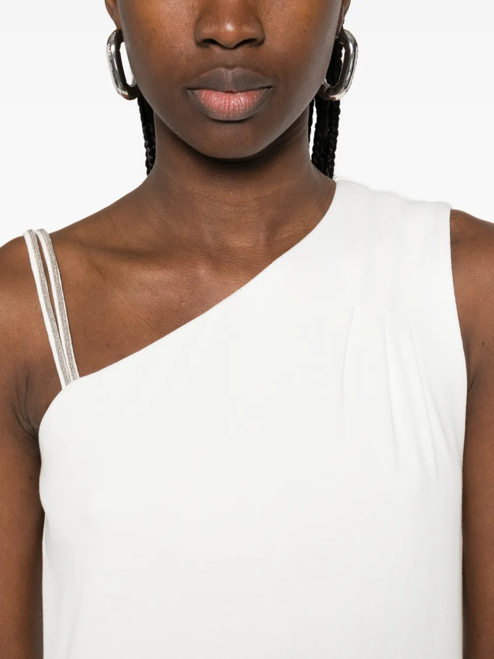 Кремовый топ без рукавов с асимметричным вырезом, украшенными цепочкой бретелями и прямым подолом