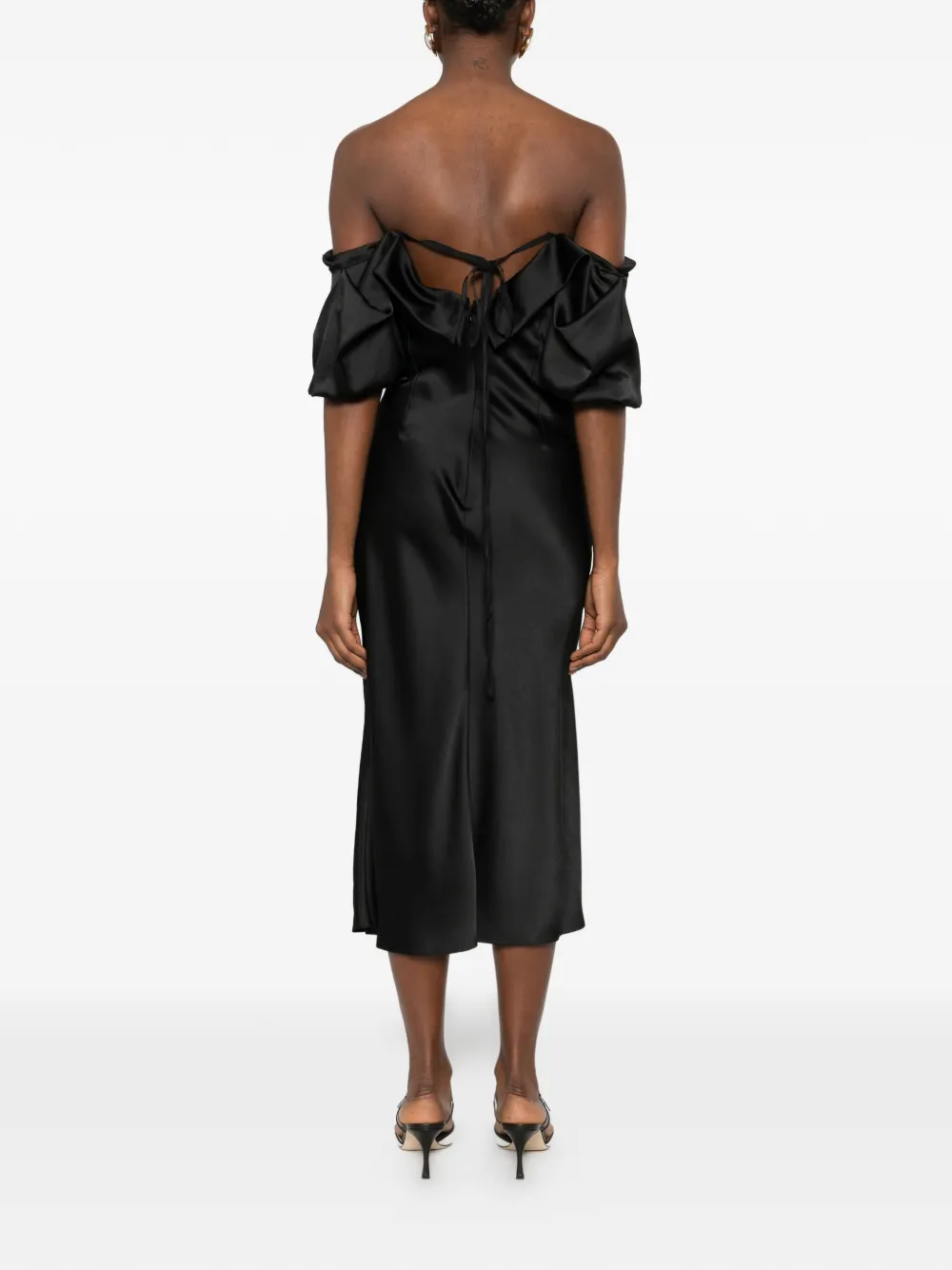 Черное платье с открытыми плечами, драпированными рукавами, сборками по бокам, длина миди