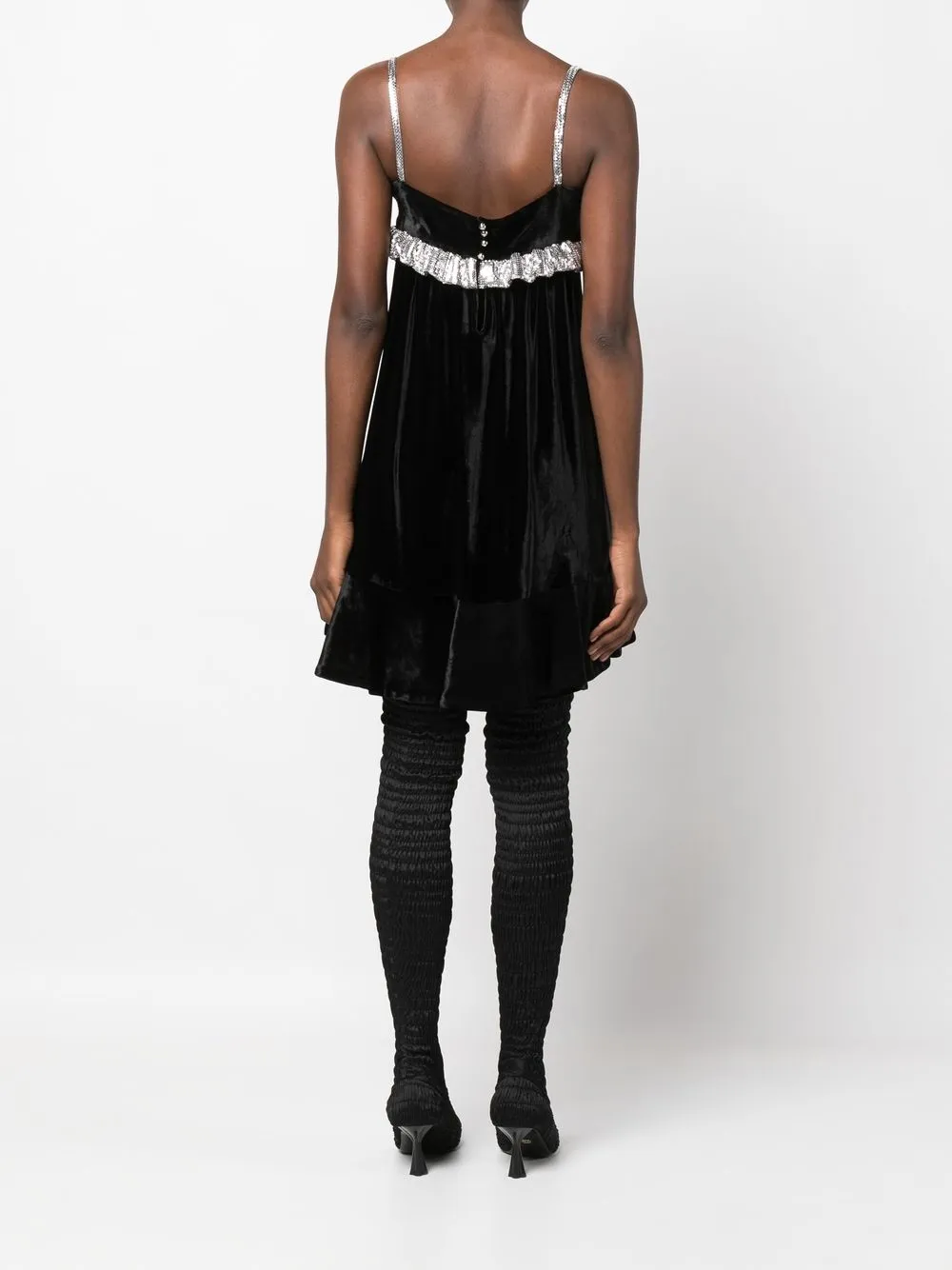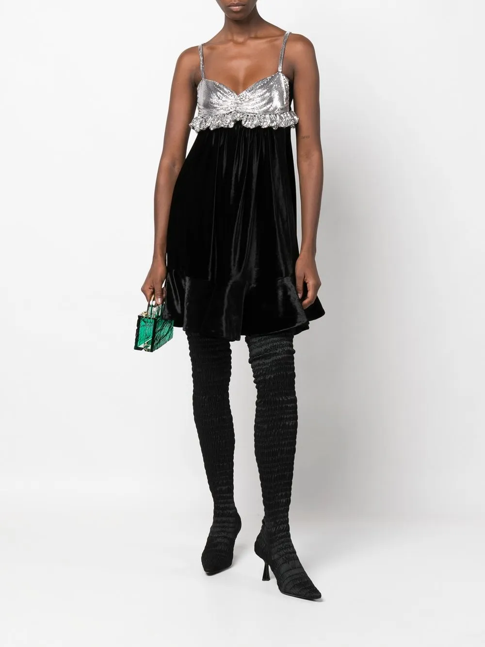 Жатый бархат, контрастные вставки, эффект кольчуги, вставки с оборками, вырез в форме сердца, потайная застежка на молнии сзади, тонкие бретели, А-образный силуэт и длина выше колена.