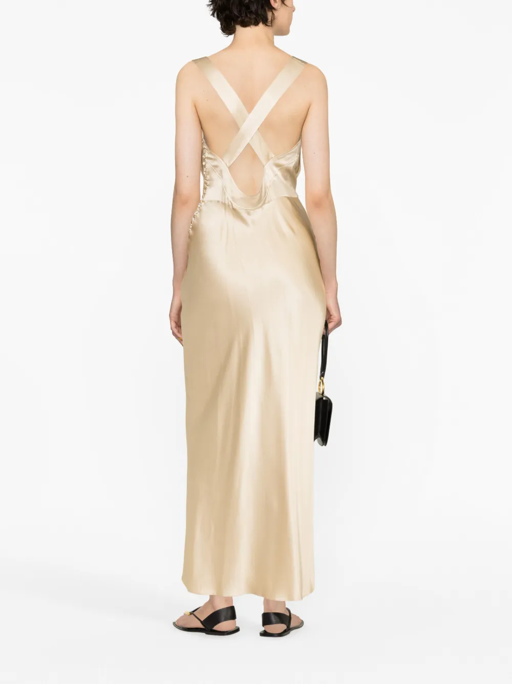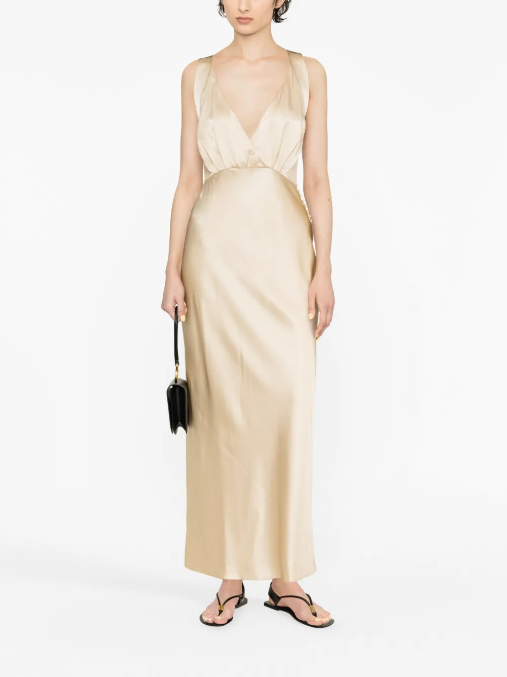 Бежевый, шелк, шармюз, приталенный силуэт, V-образный вырез, пуговичная застежка сбоку, без рукавов, перекрестные бретели на спине и прямой подол.