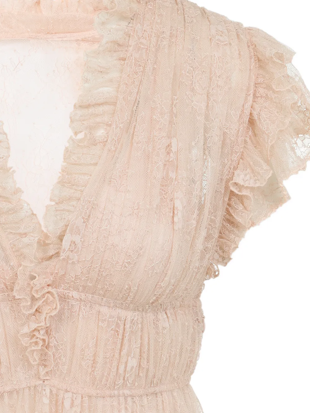 Бежевое кружевное платье с рюшами, V-образным вырезом, короткими рукавами и перекрещенными бретелями на спине