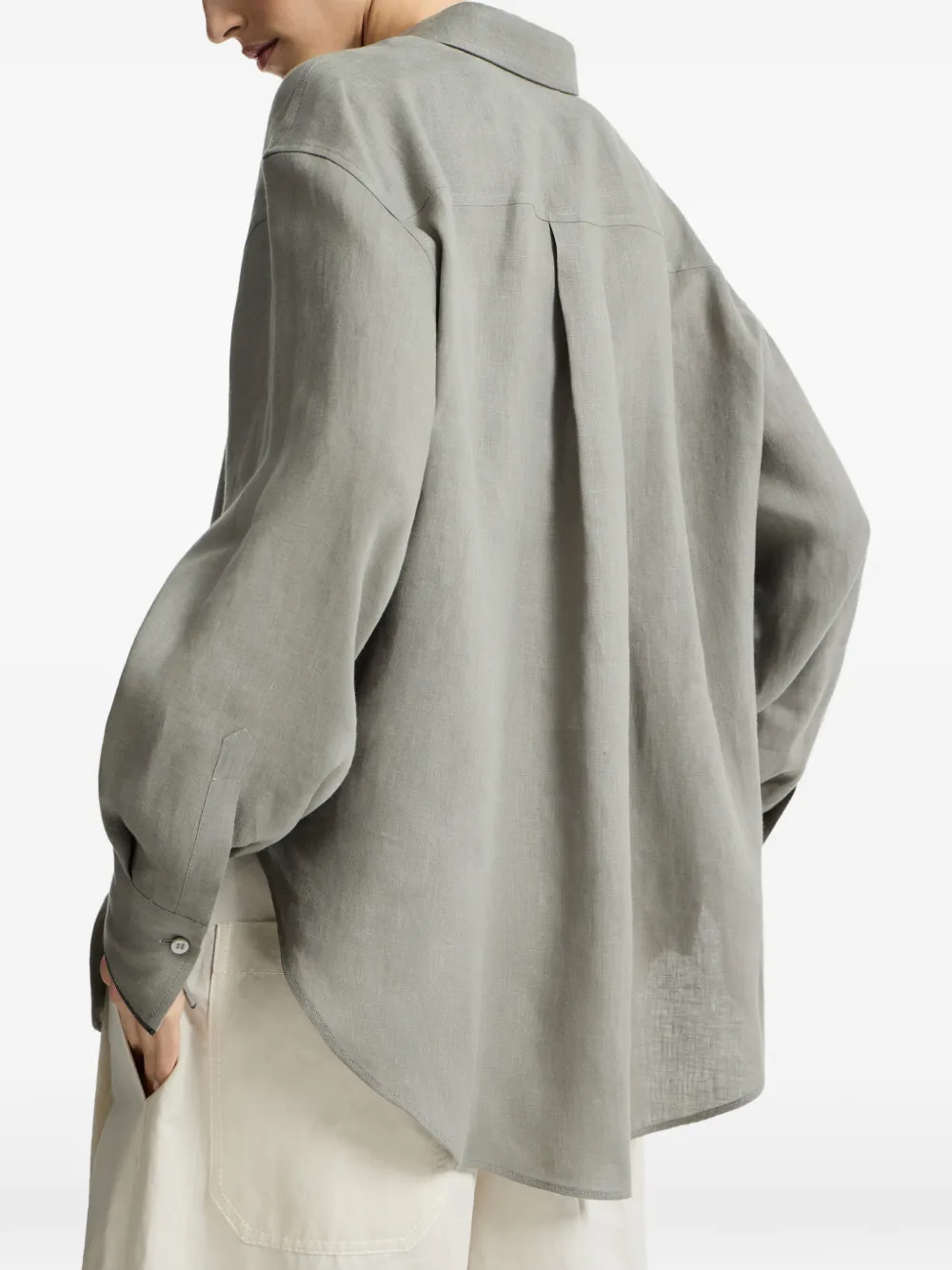 Зеленая льняная рубашка с отложным воротником, застежкой на пуговицы, длинными рукавами и складкой сзади