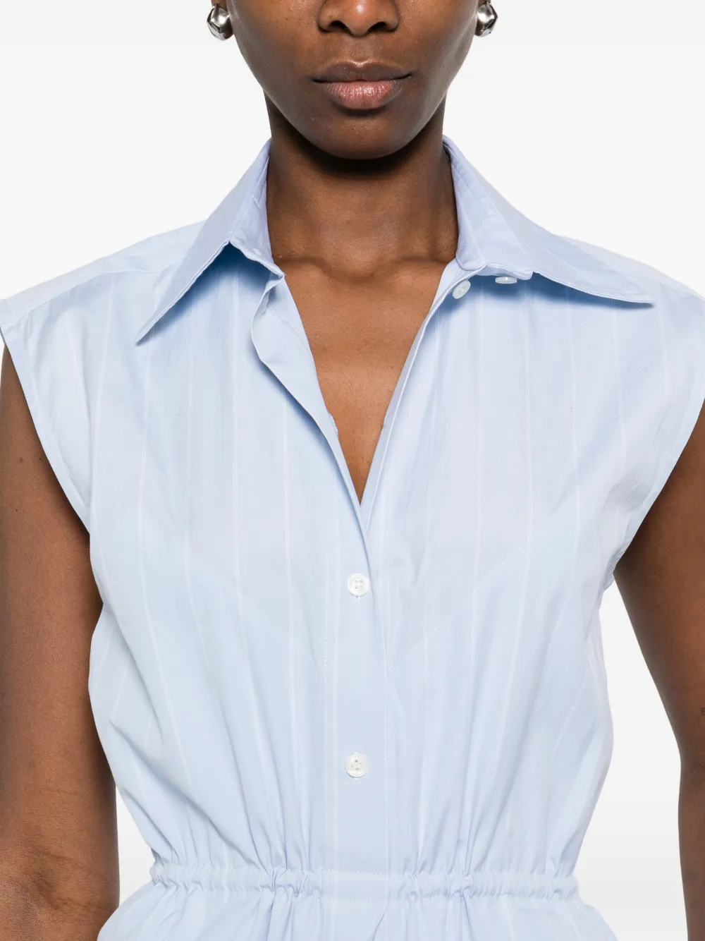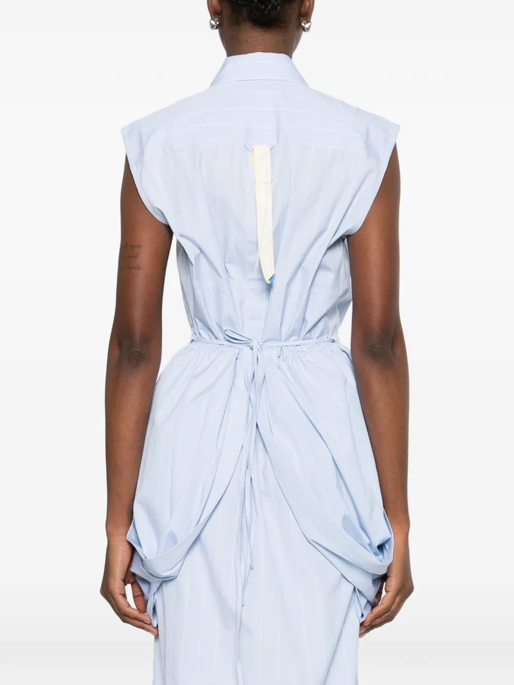 Синий полосатый дизайн с панелями, классический воротник, застежка на пуговицы спереди, боковая завязка