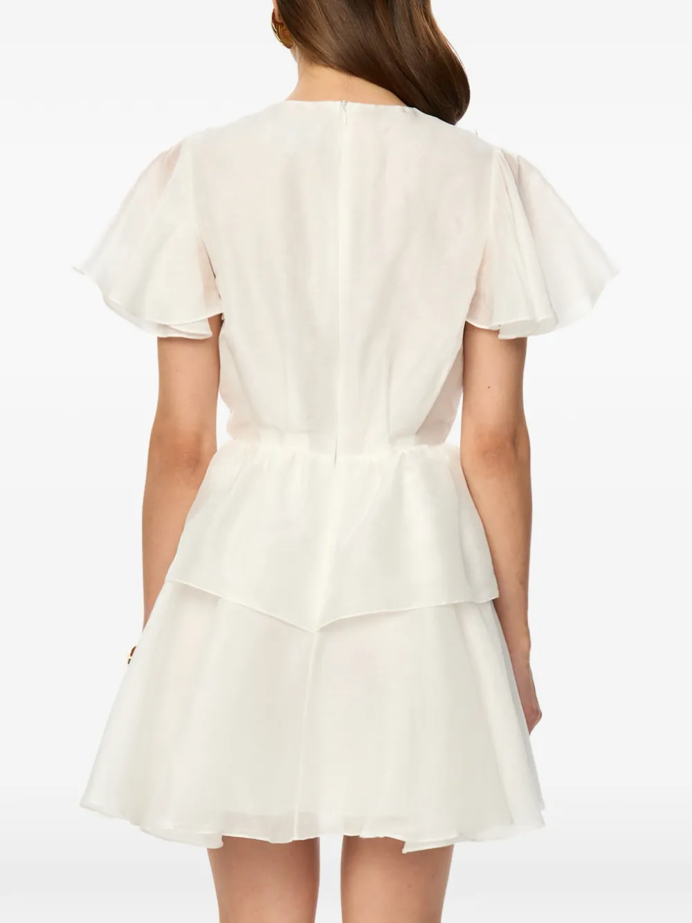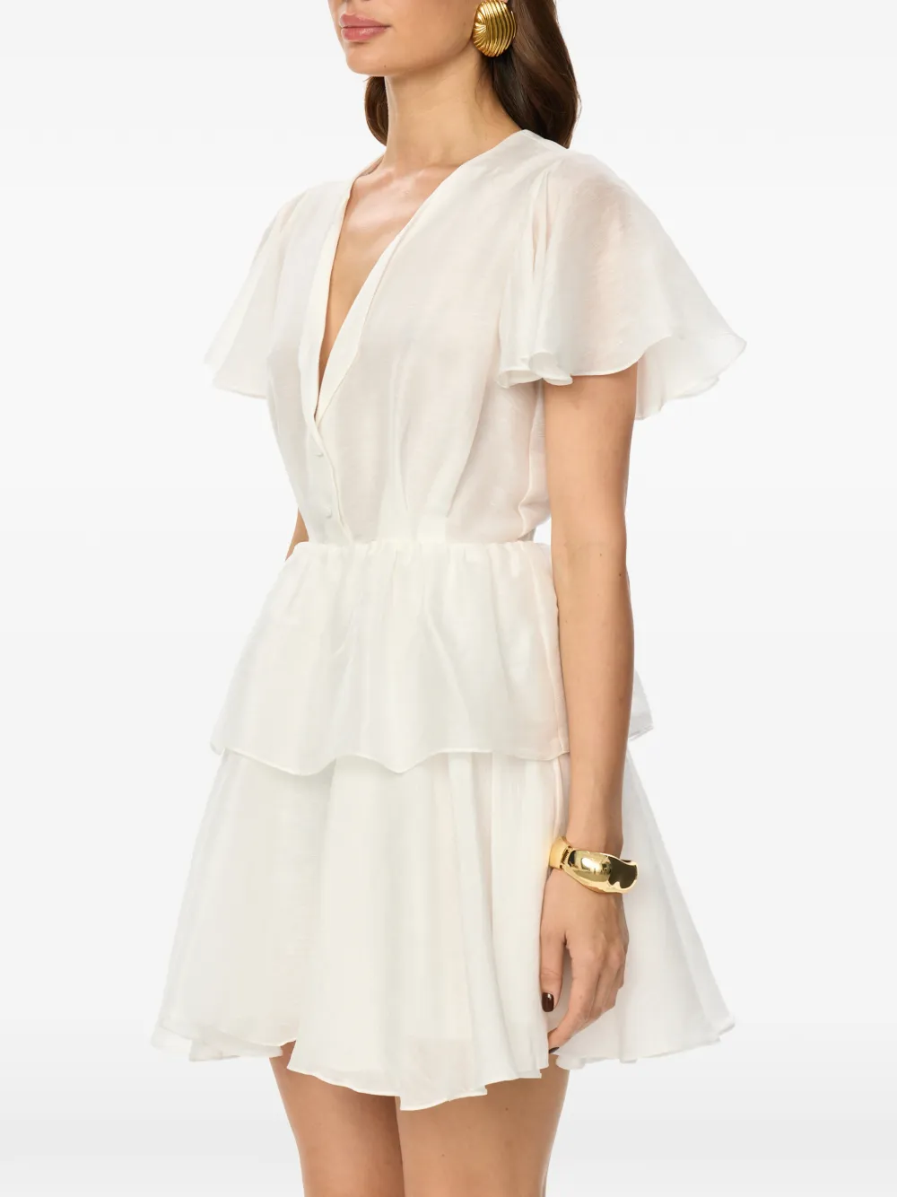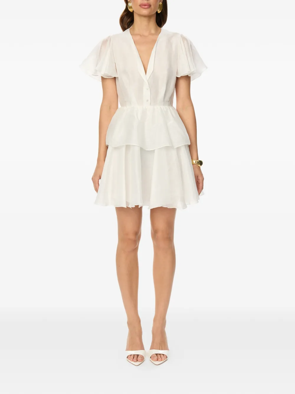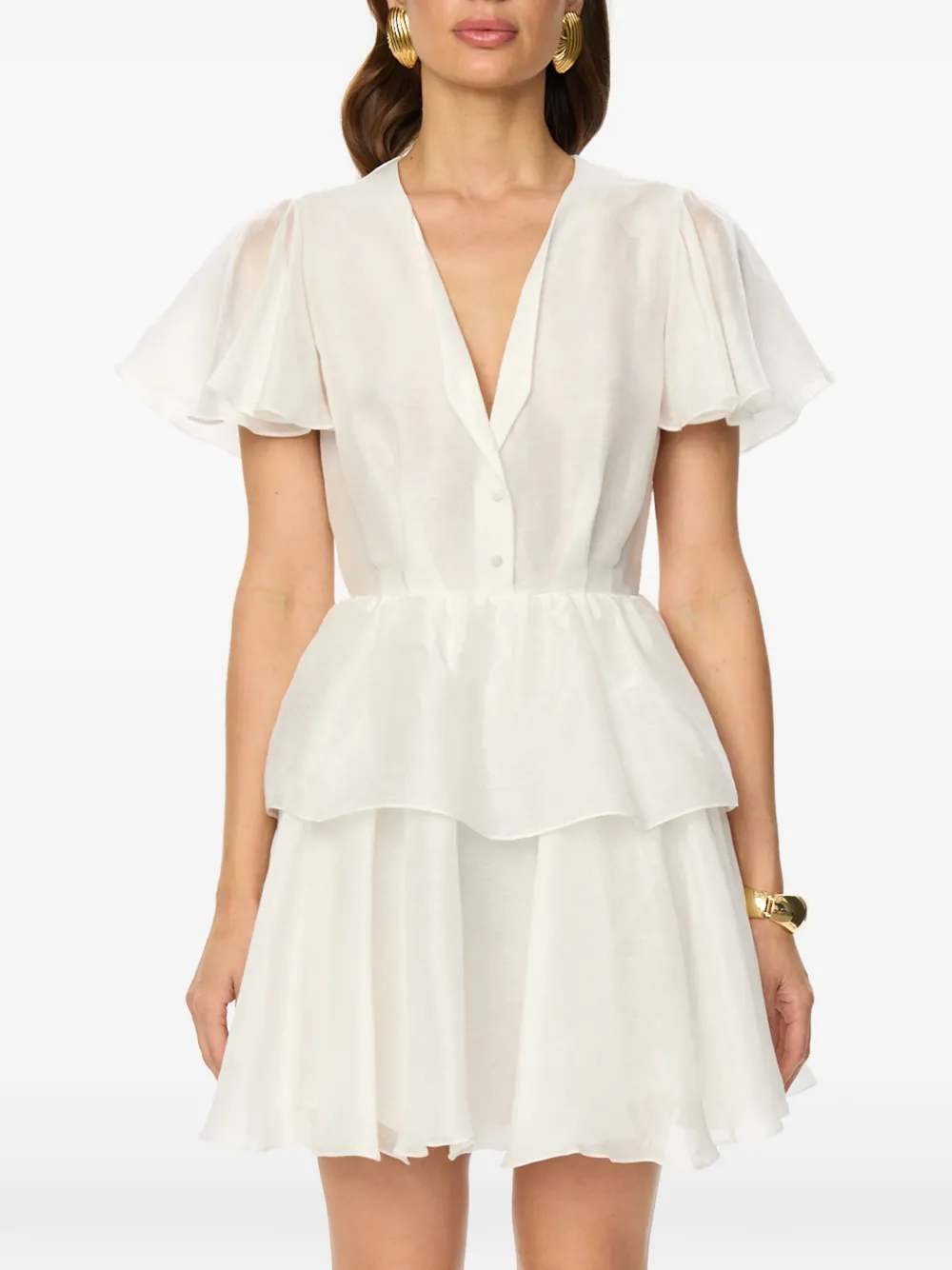 Белое платье с V-образным вырезом, застежкой-молнией сзади, рукавами с оборками, пеплумом и многослойной юбкой