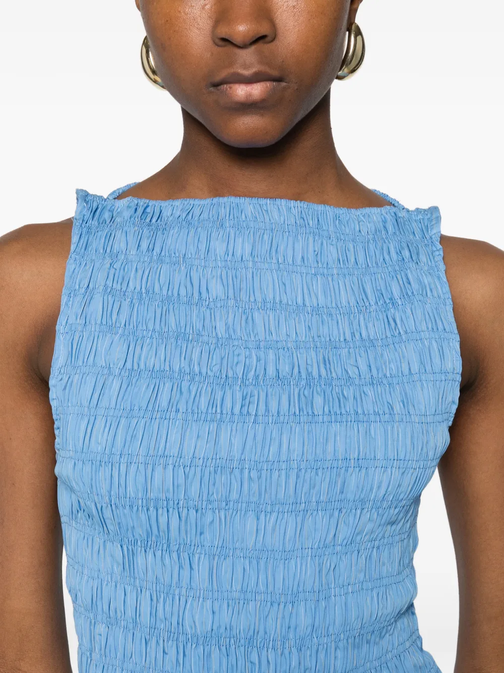 Синее платье без рукавов с присборенным лифом, плиссированной юбкой и расклешенным подолом