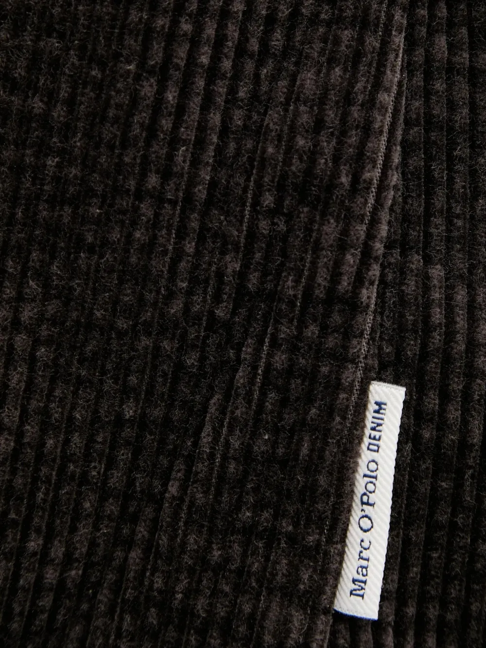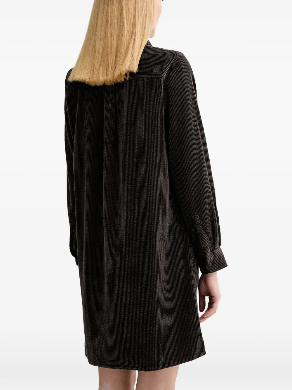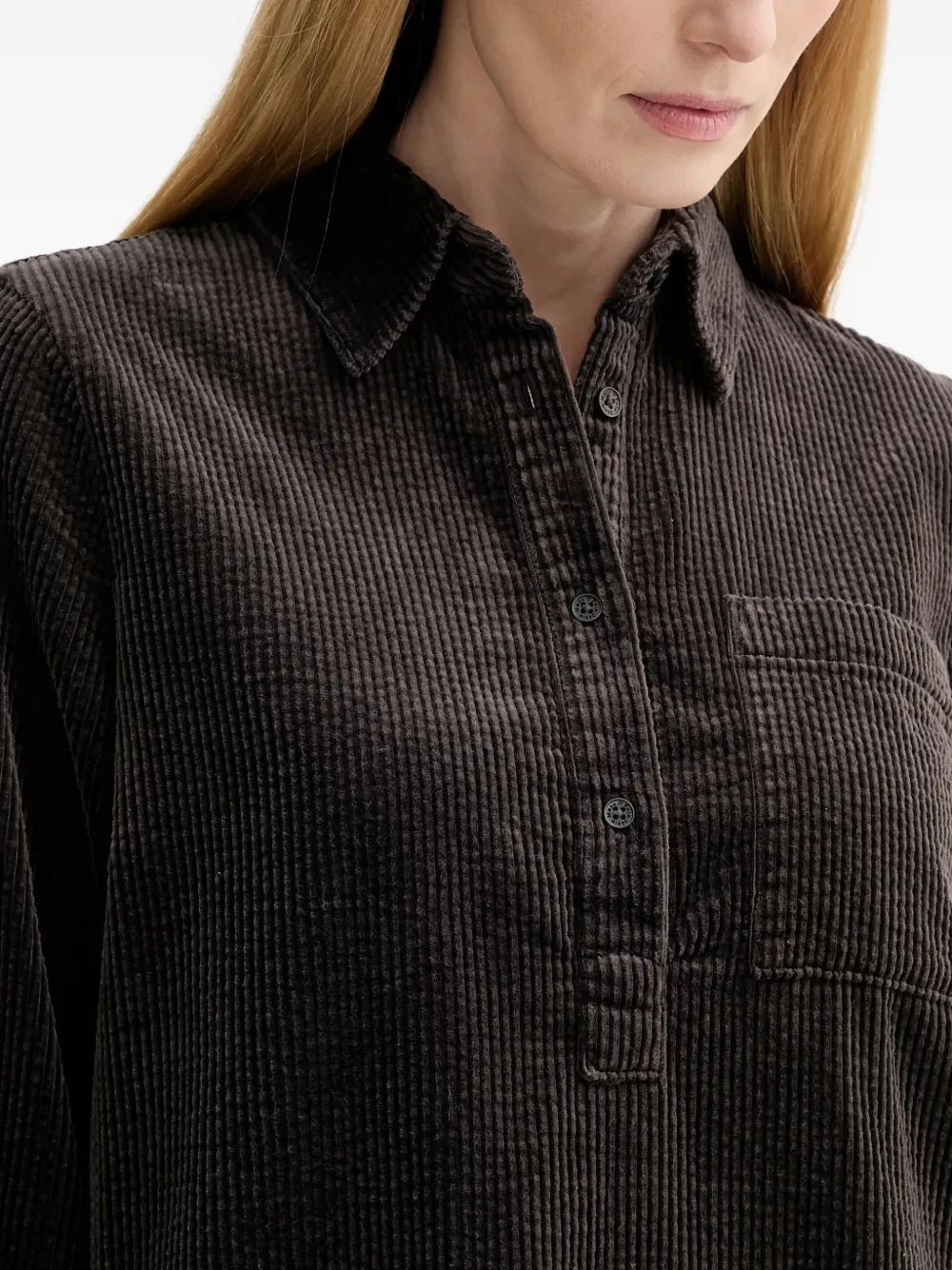 Темно-коричневый вельвет, текстура, нагрудный карман, застежка на пуговицы, длинные рукава, воротник