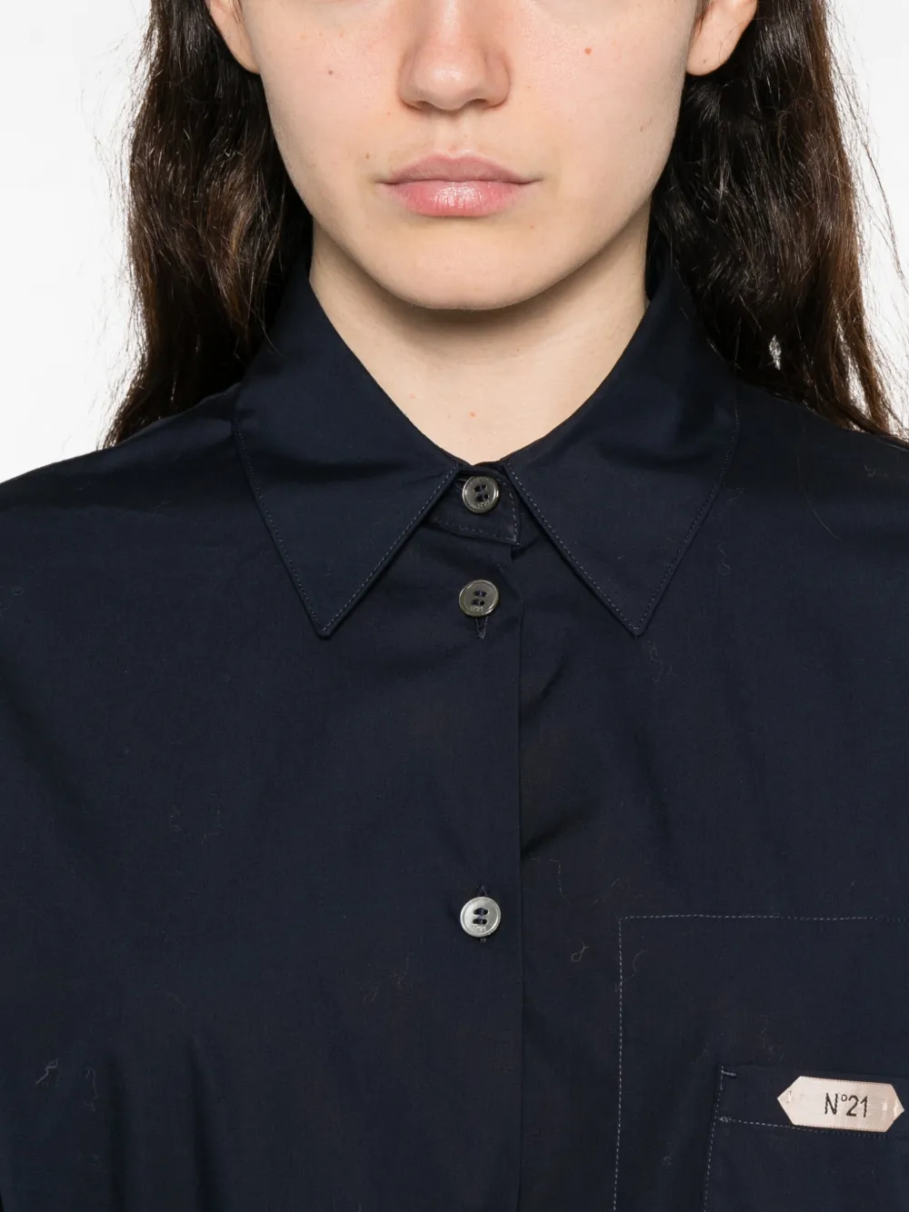 Синий цвет, воротник-пуанта, короткие рукава, нагрудный карман, застежка на пуговицы, отделка рюшами