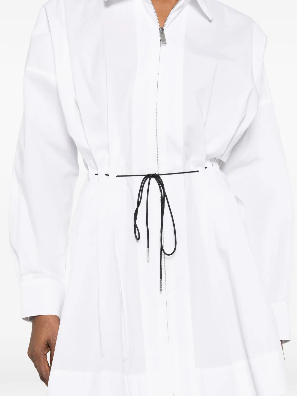 Белый цвет, застежка на молнию, кулиска, воротник с острыми уголками, длинные рукава, складки