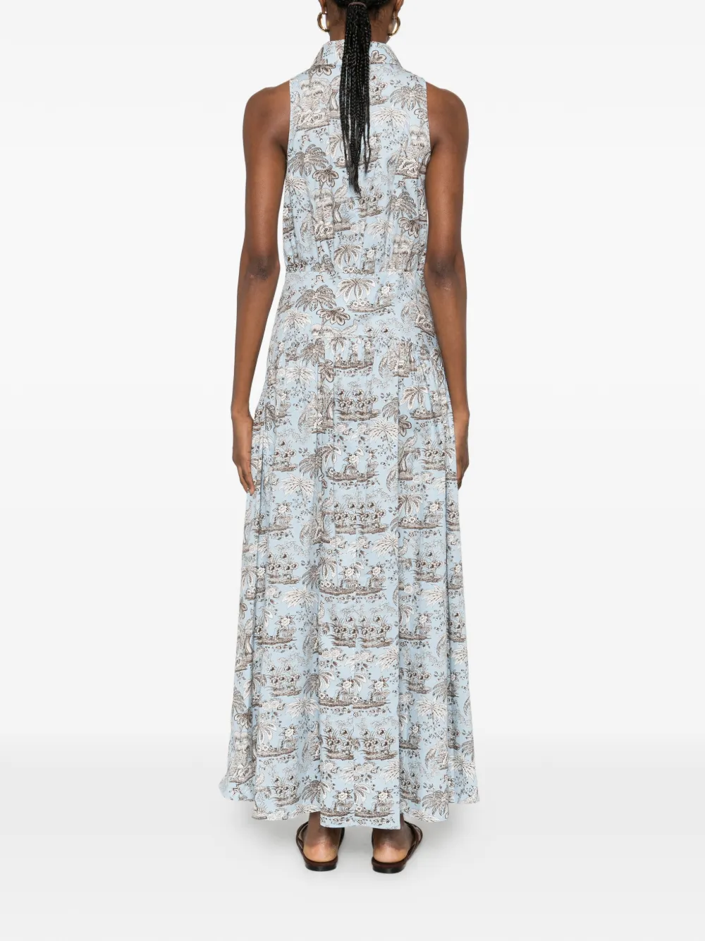 Светло-голубое платье без рукавов с отложным воротником поло, цветочным принтом и плиссированной юбкой