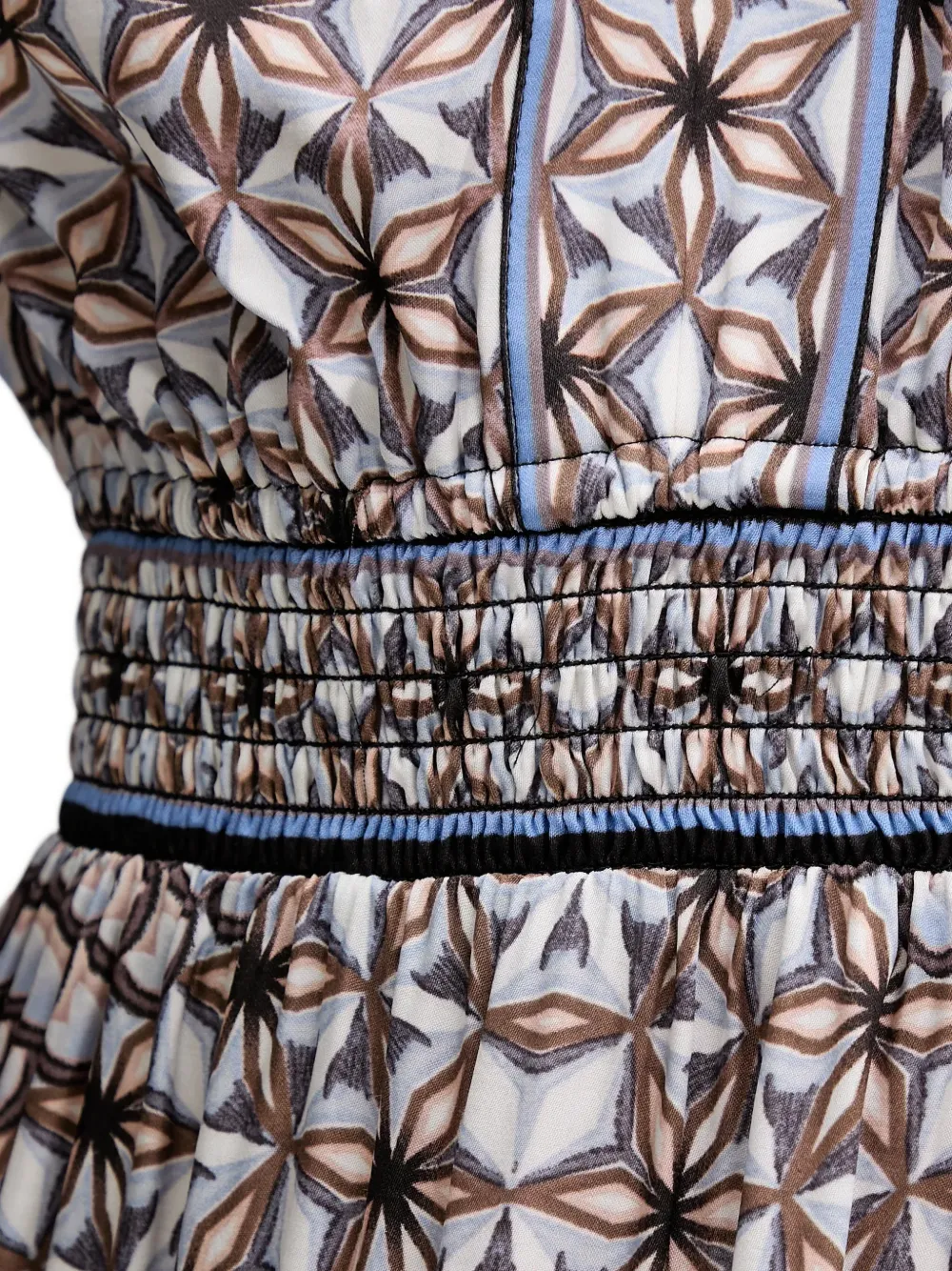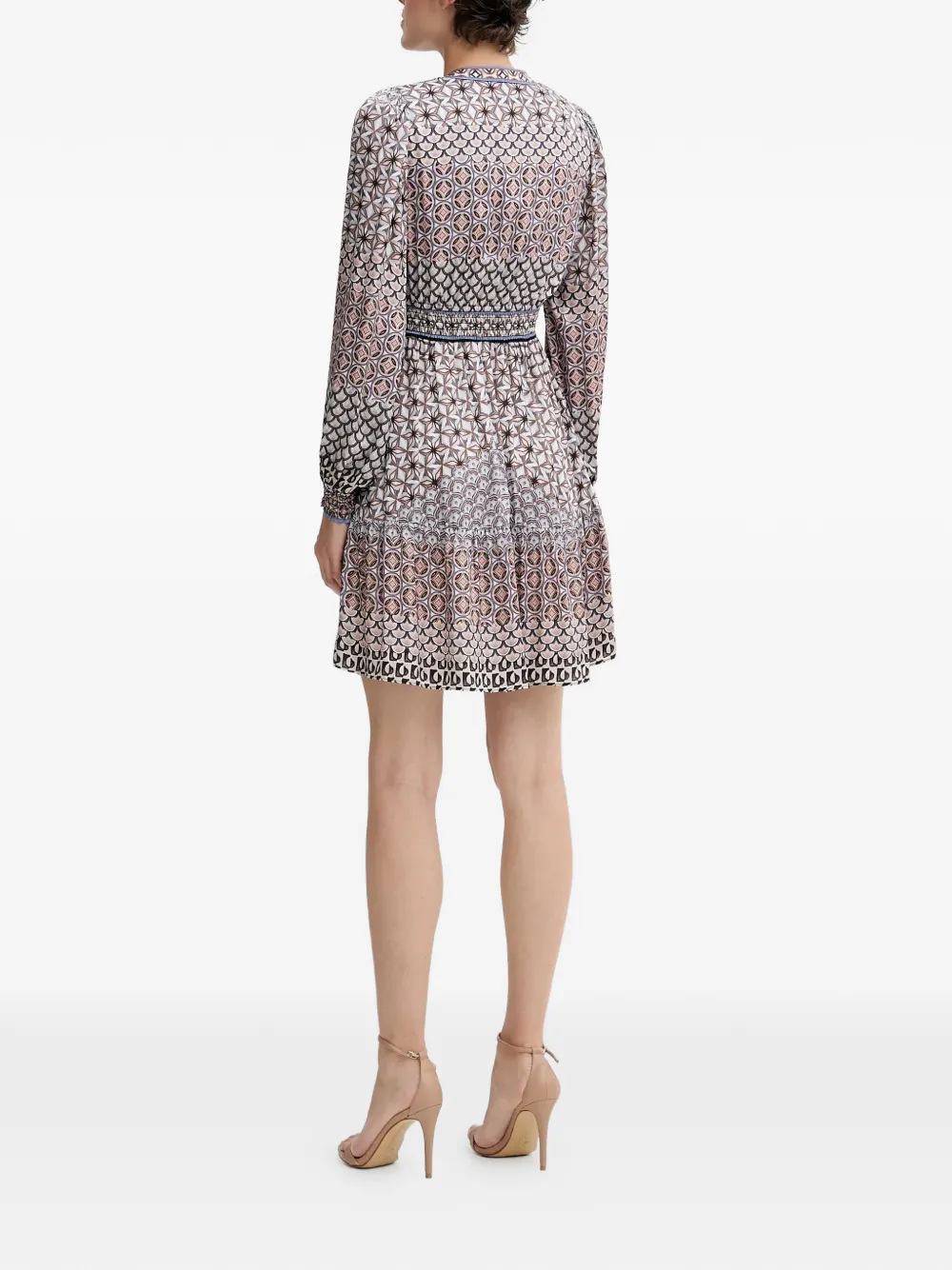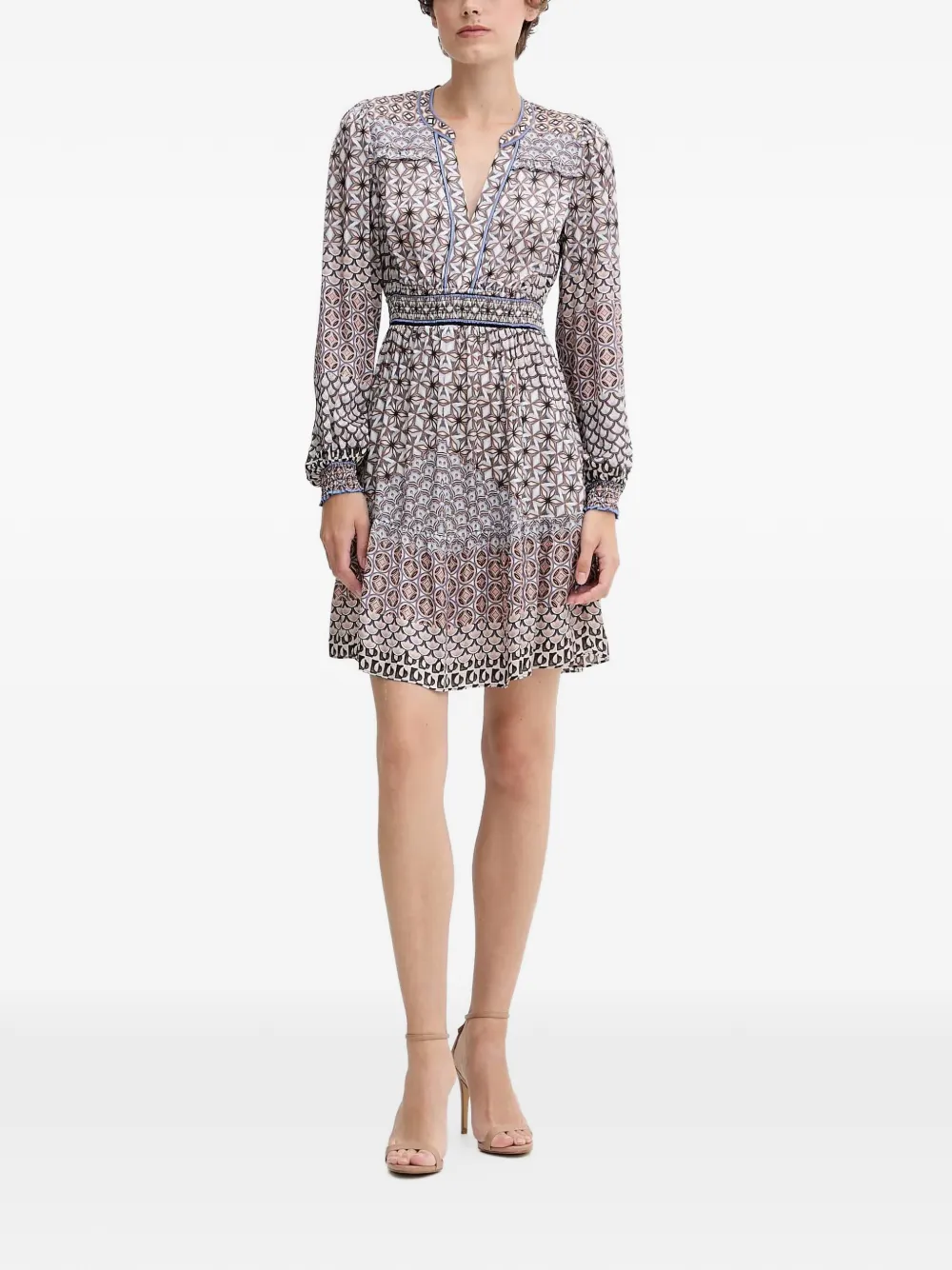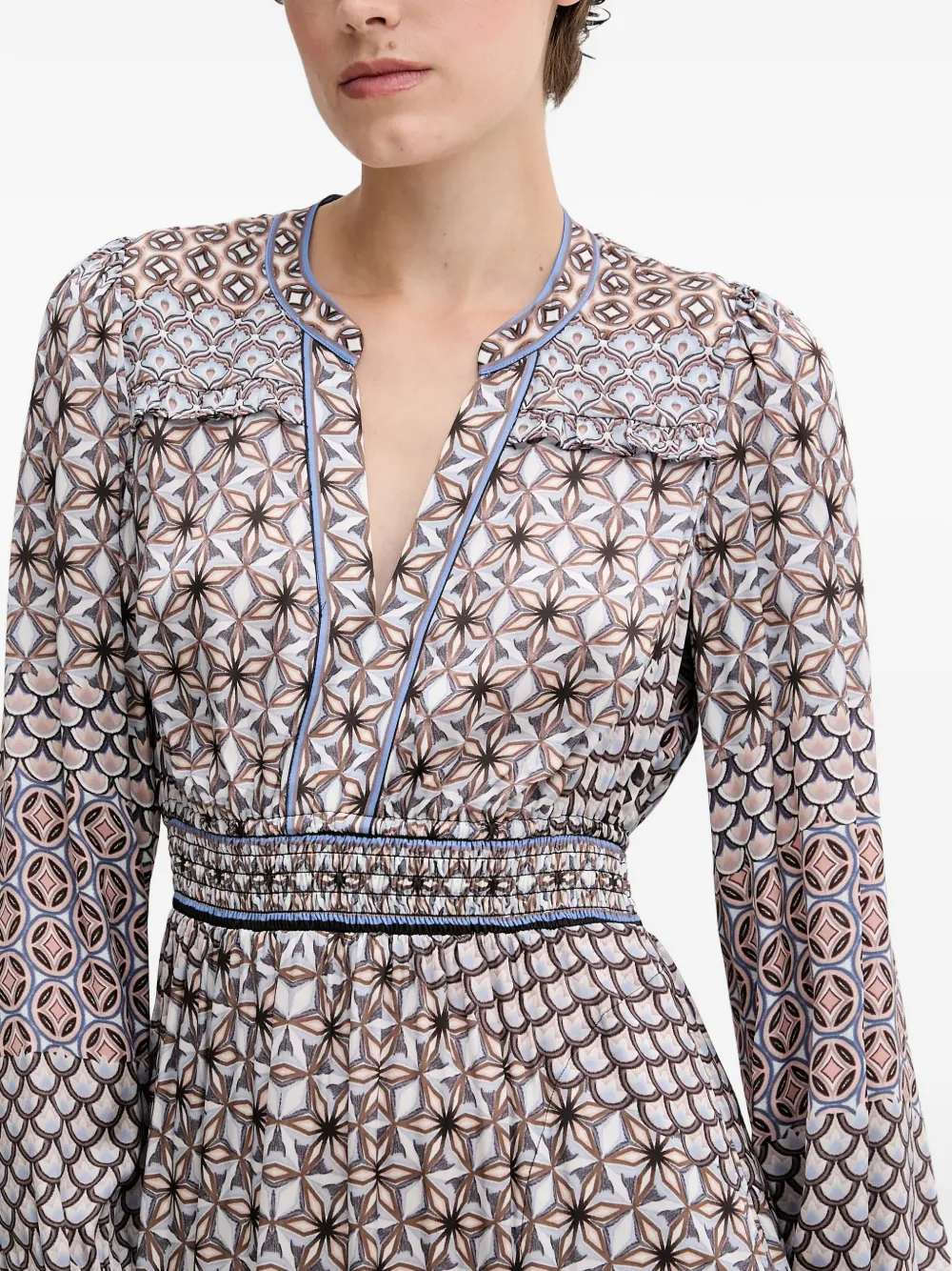 Бежевое и разноцветное платье с цветочным принтом, V-образным вырезом, присборенной талией, длинными рукавами и отделкой