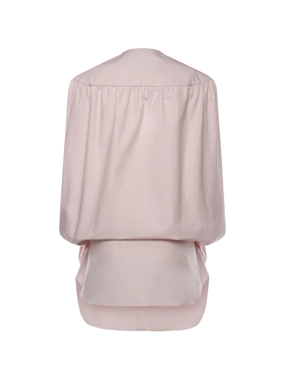 Розовое платье свободного кроя с присборенными деталями и круглым вырезом