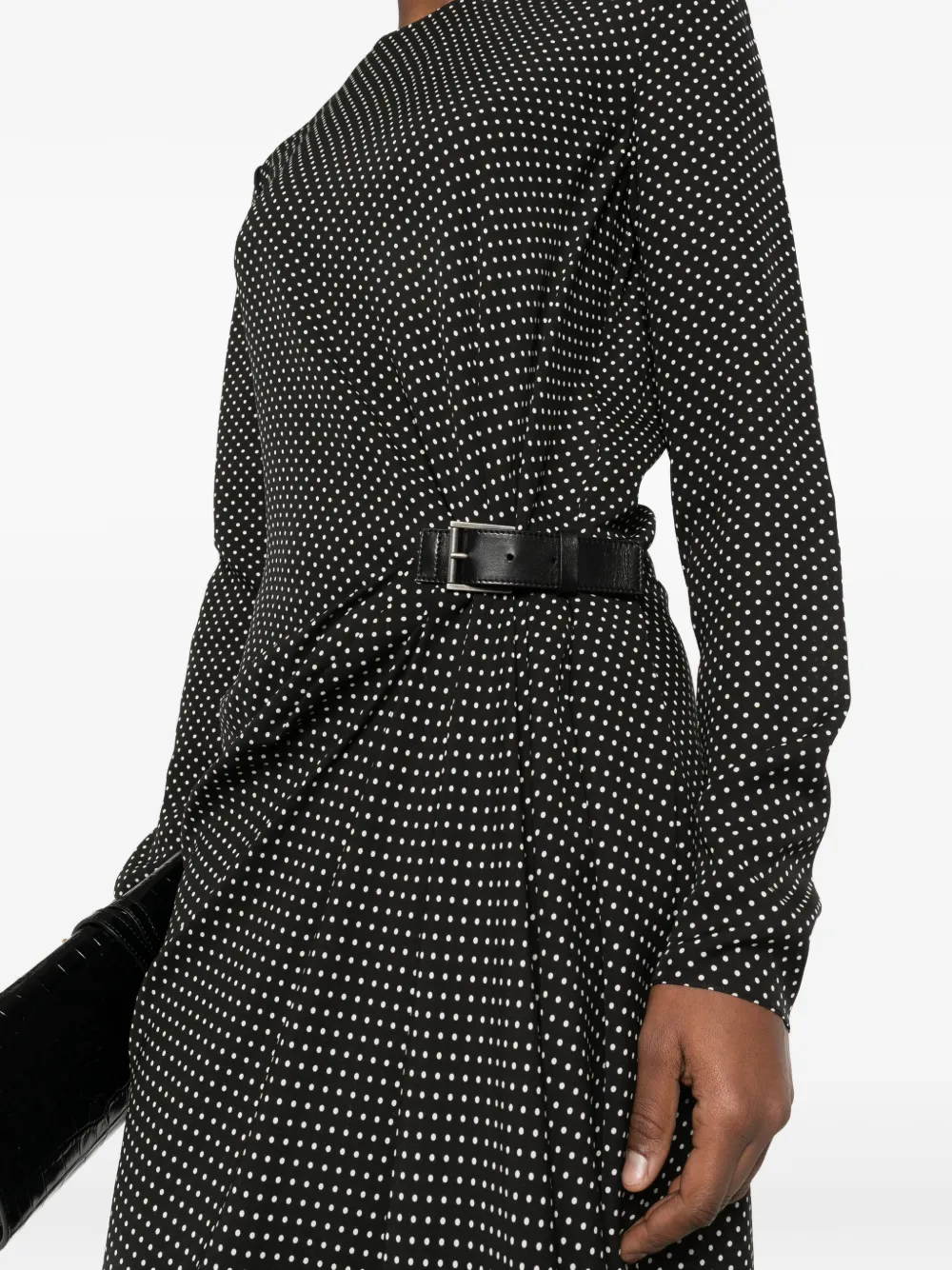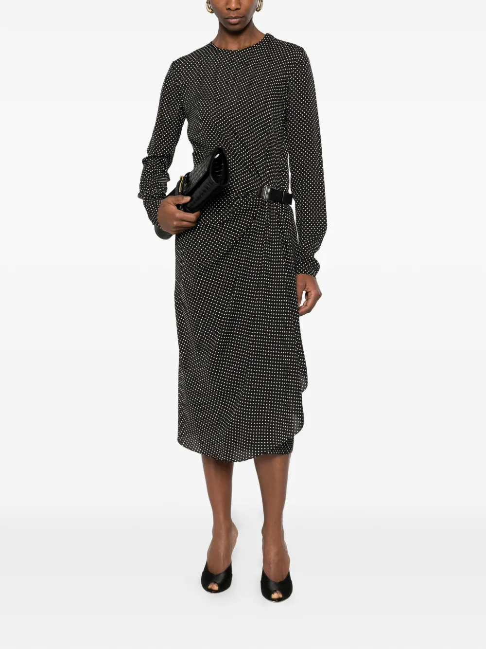 Черный и молочно-белый принт в горох, длинные рукава, кожаный пояс, драпировка