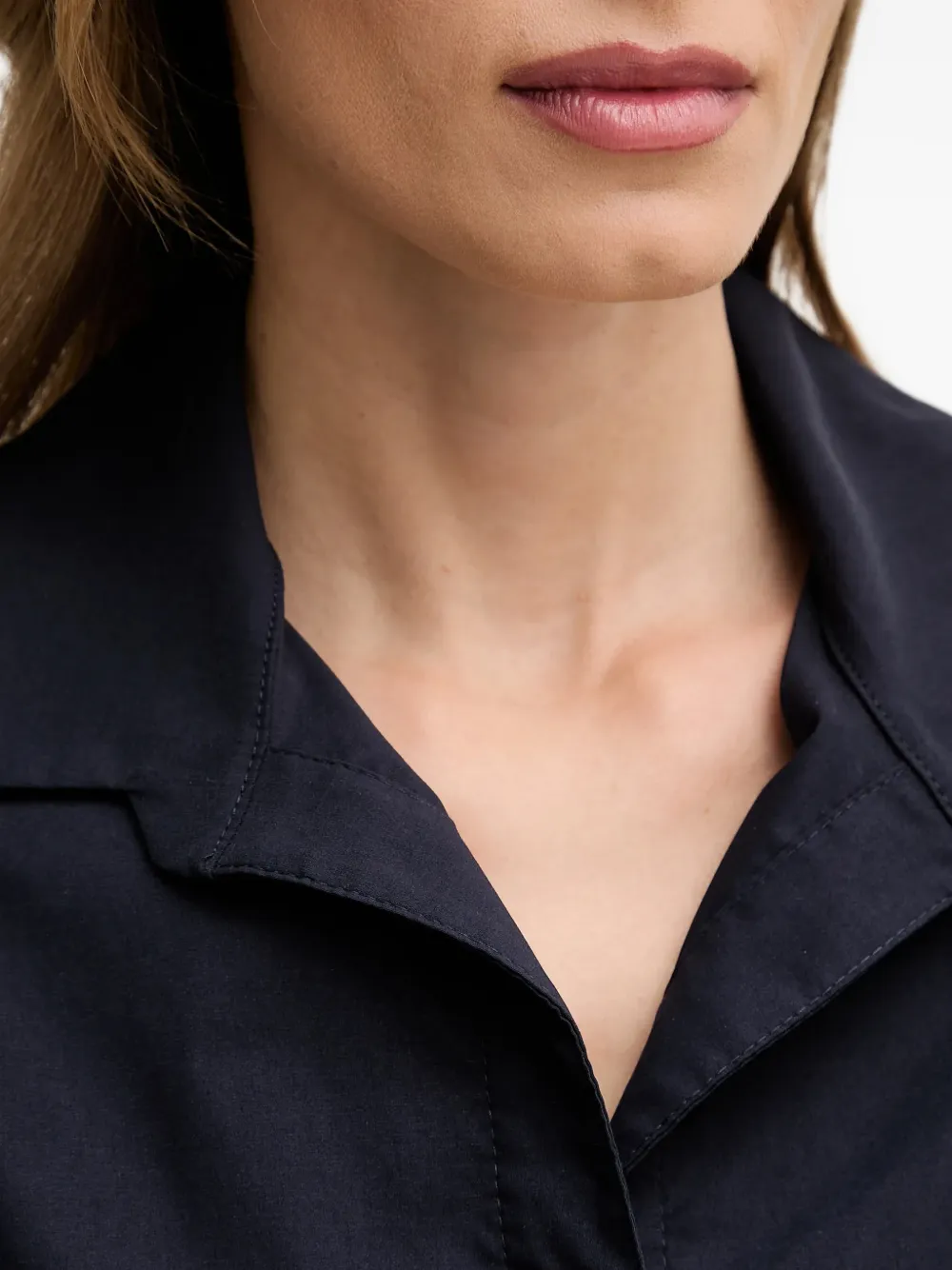 Голубой пиджачный воротник, короткие рукава, застежка на пуговицы, отделка-панели