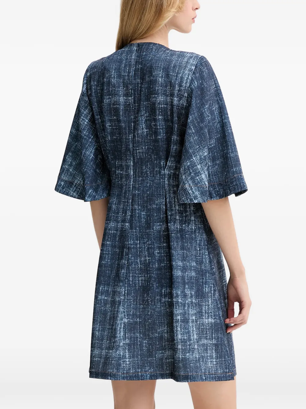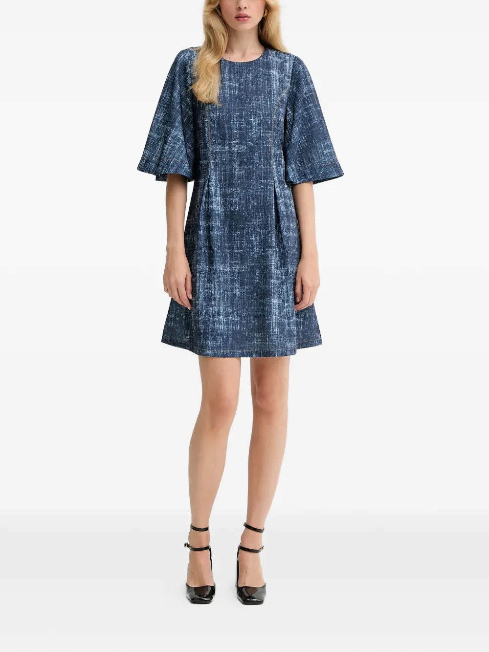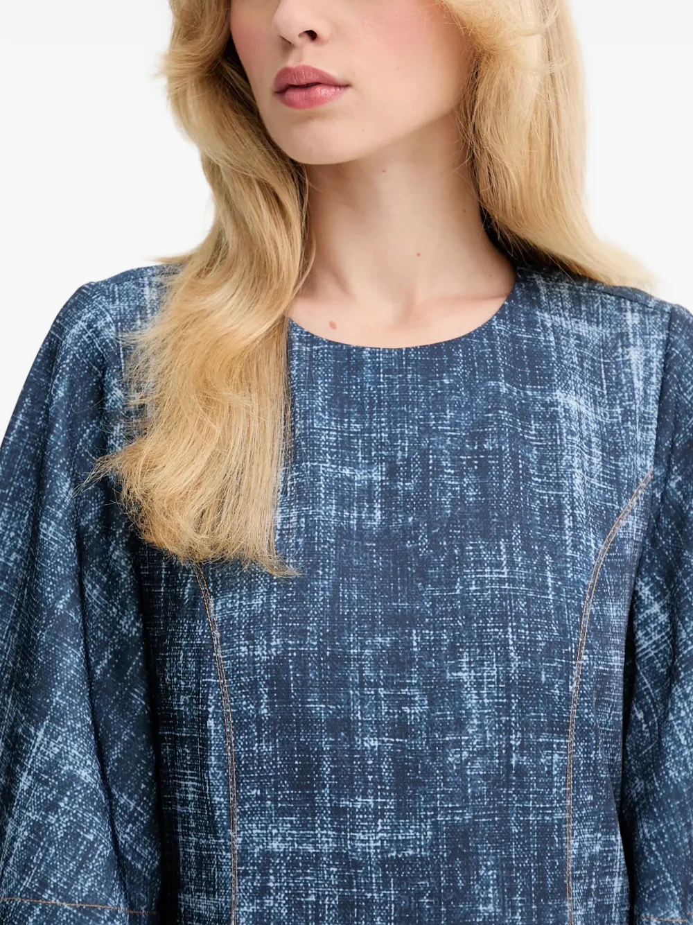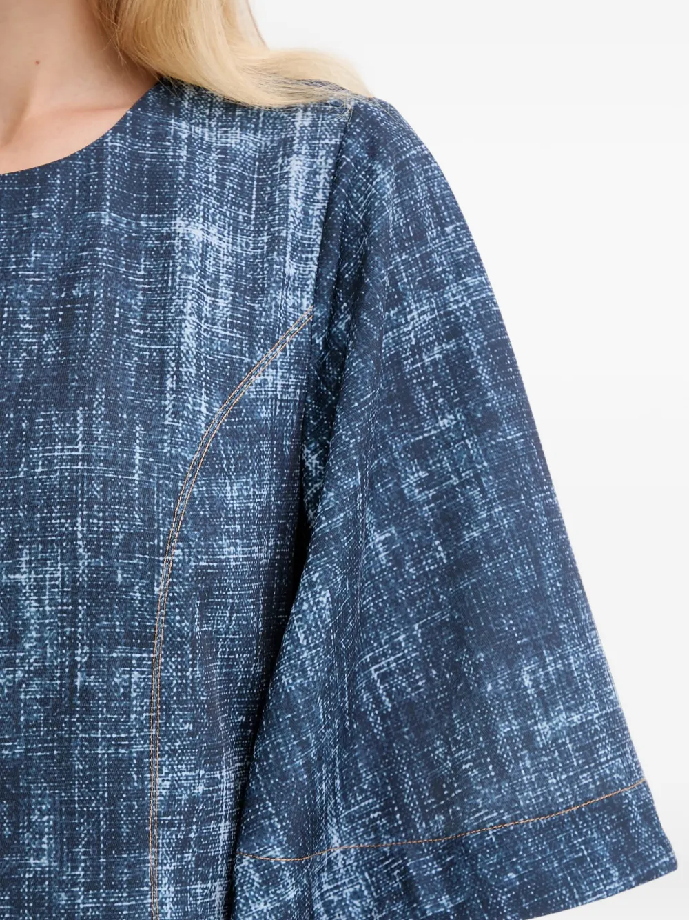 Джинсовый синий, узор по всей поверхности, расклешенные рукава, круглый вырез, отделка швами, плиссированная деталь на спинке