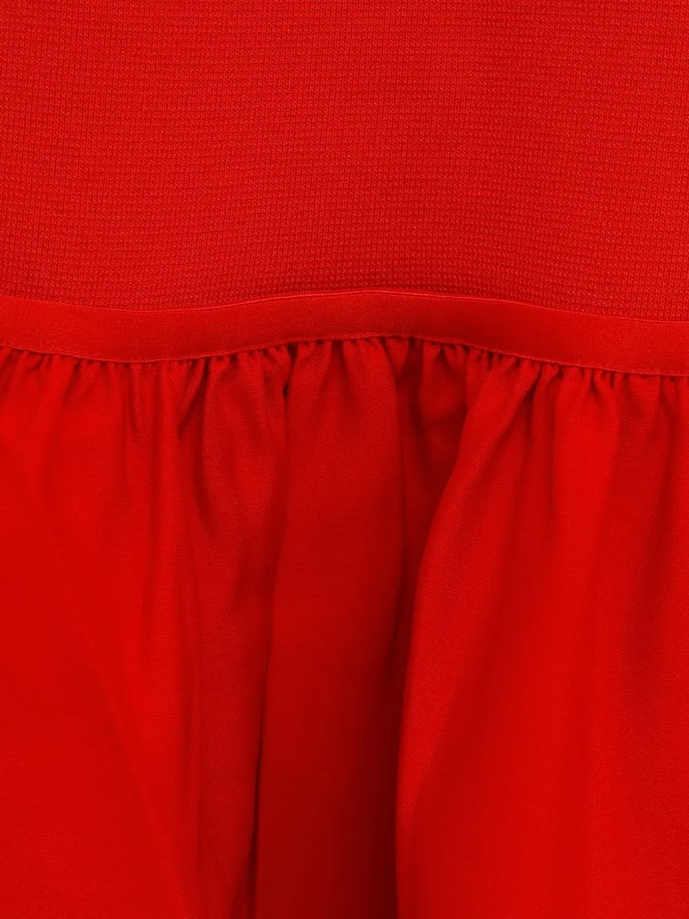 Красное платье с оборками, круглый вырез, короткие рукава, скрытая застежка-молния, длина миди