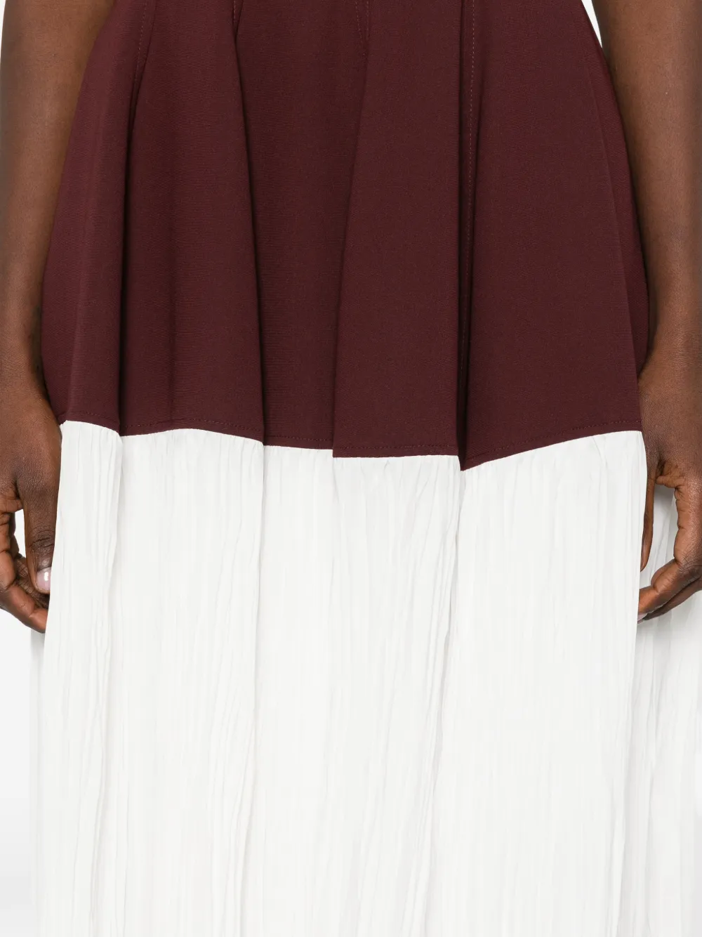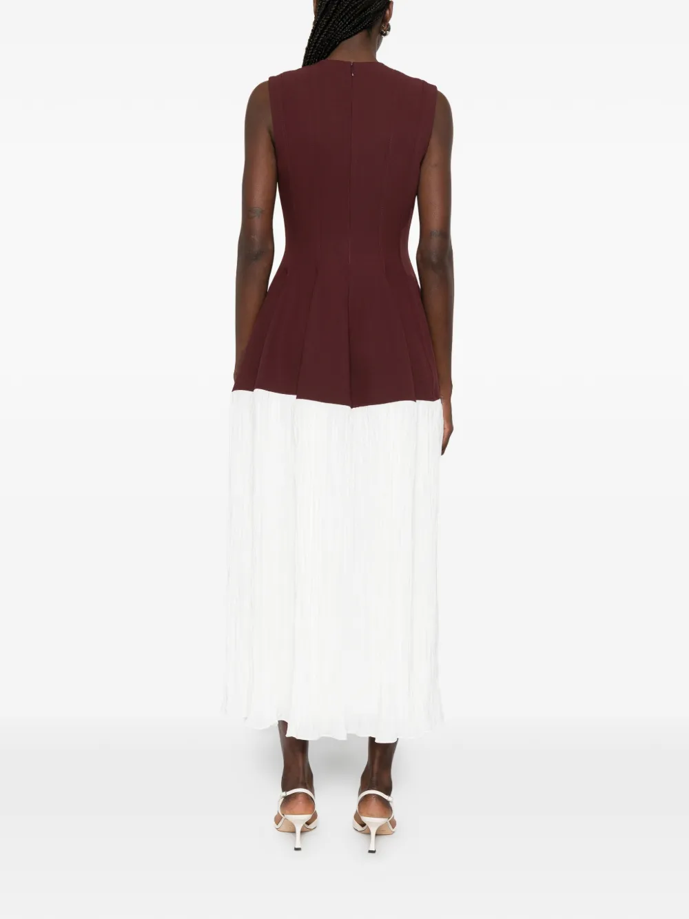 Коричнево-белая плиссированная юбка, без рукавов, круглый вырез, застежка-молния