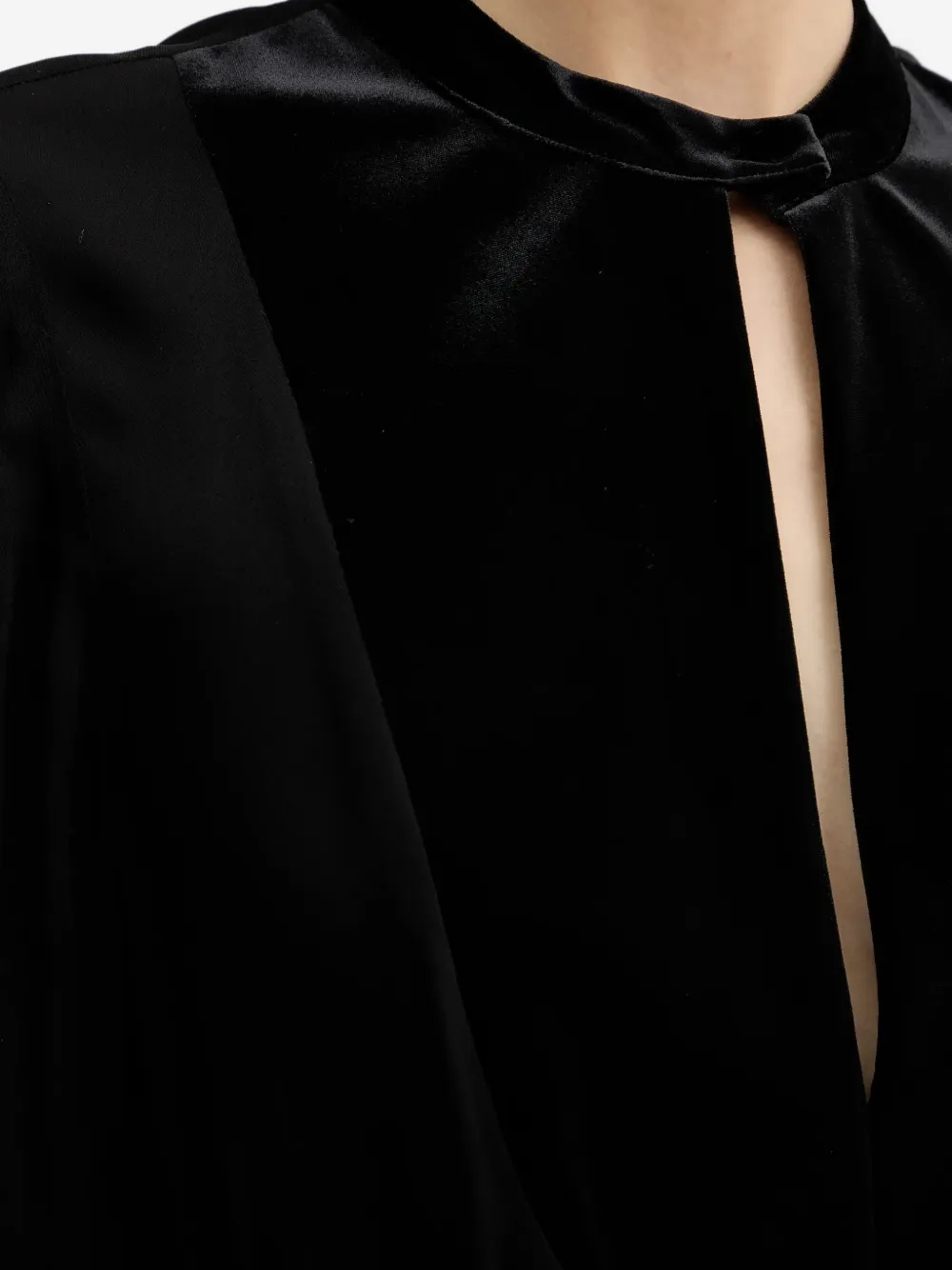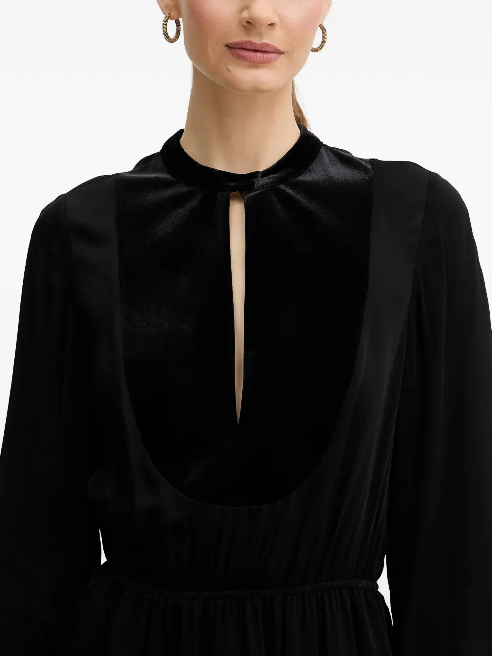 Черное бархатное платье с вырезом-каплей, длинными рукавами и присборенной талией