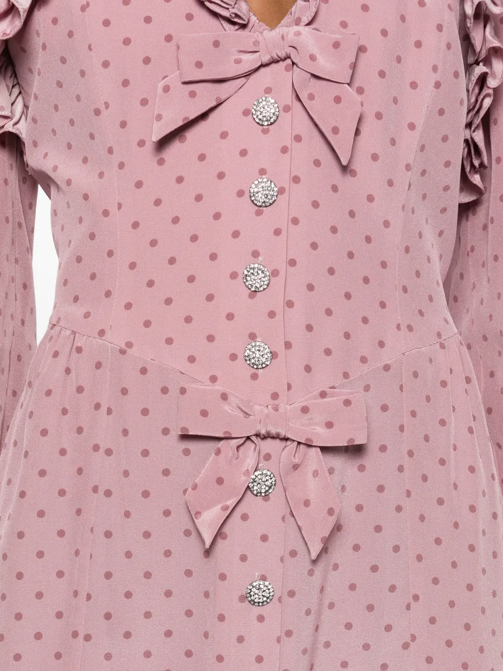 Розовая ткань в горошек, V-образный вырез, бант, украшенные пуговицы, оборчатая отделка