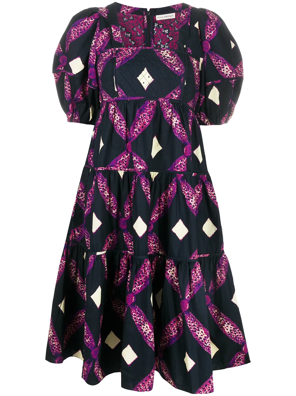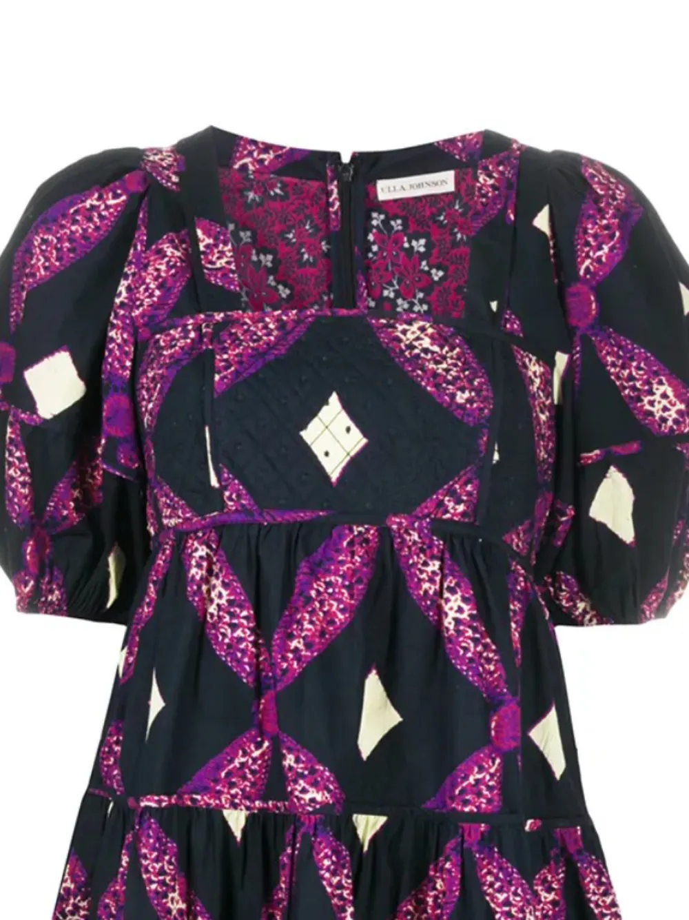Платье с принтом от Ulla Johnson. Квадратный вырез, короткие рукава с манжетами, графический принт и расклешенный силуэт.