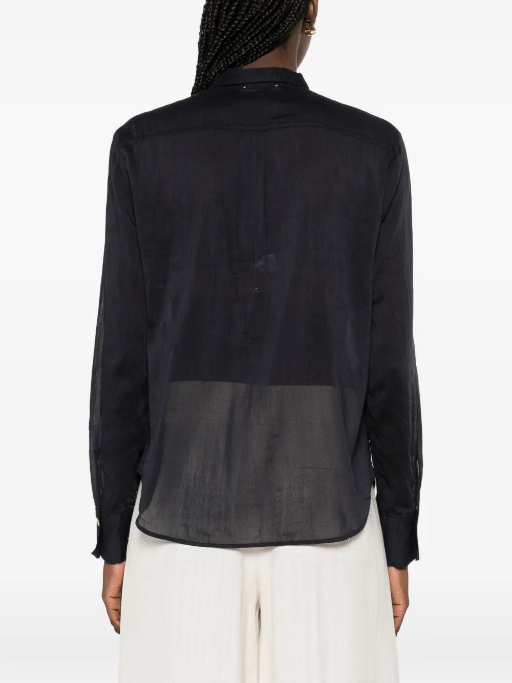 Индиго-синий, застежка на пуговицы, отложной воротник, длинные рукава, прозрачные вставки