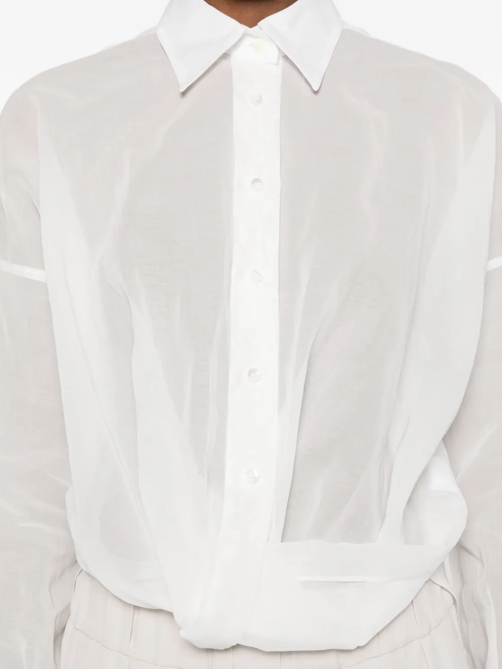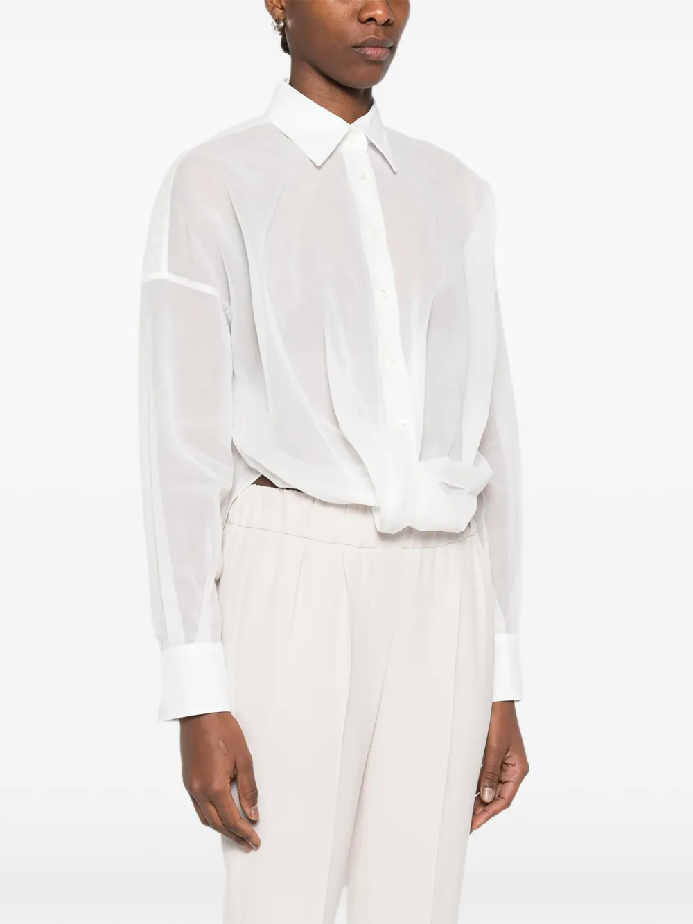 Белый цвет, длинные рукава, манжеты на пуговицах, заостренный воротник, застежка на пуговицы
