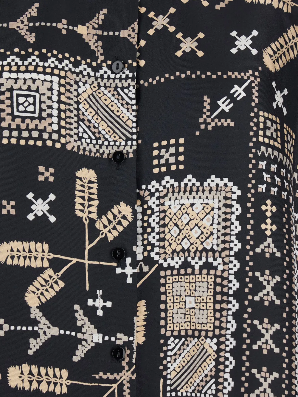 Черная многоцветная с узором, застежка на пуговицы, длинные рукава, стойка-воротник