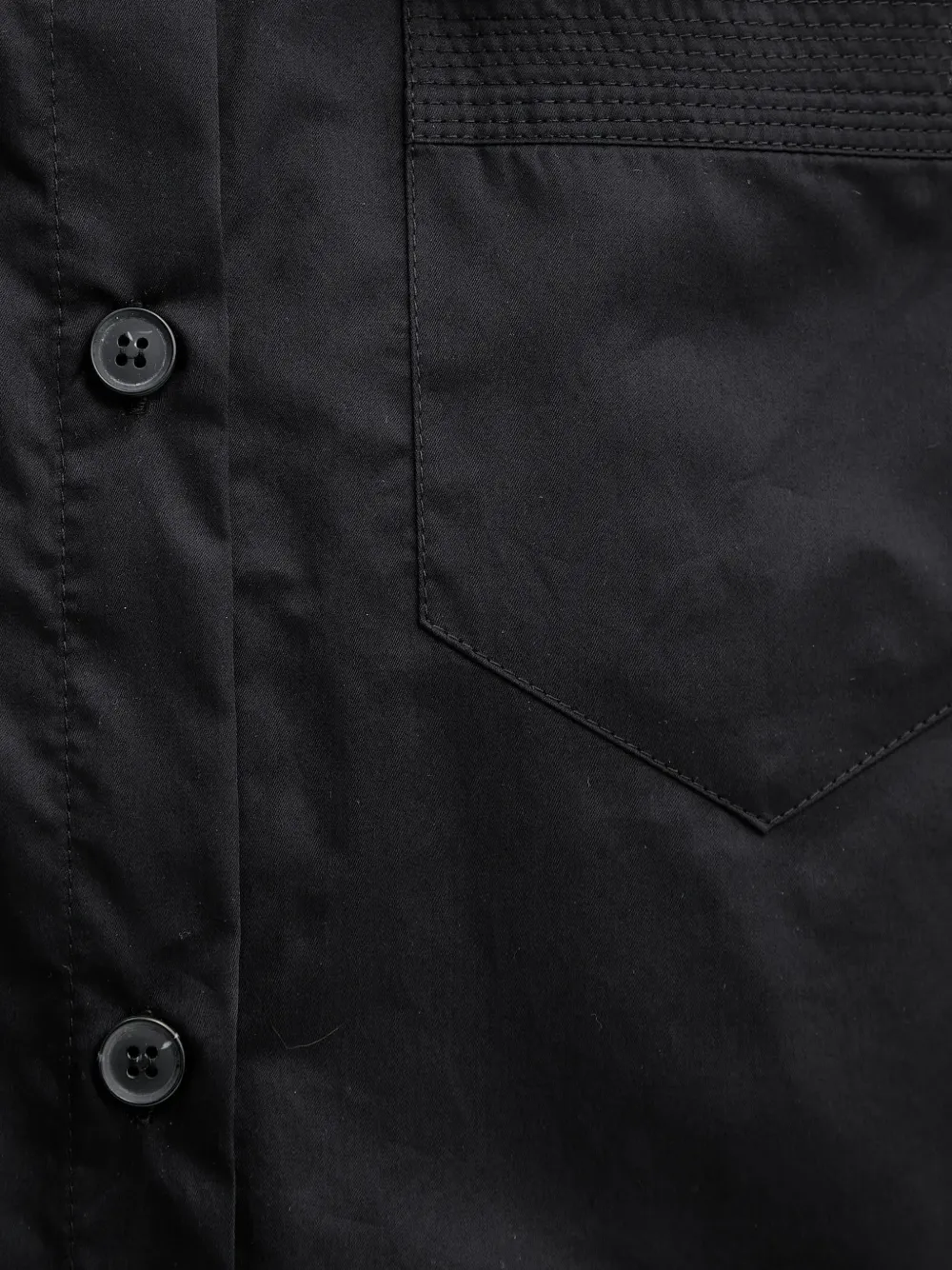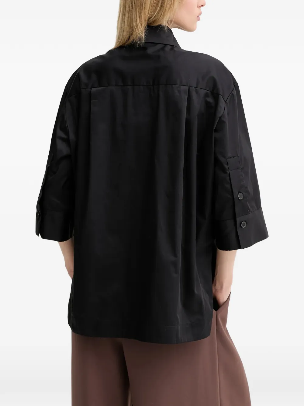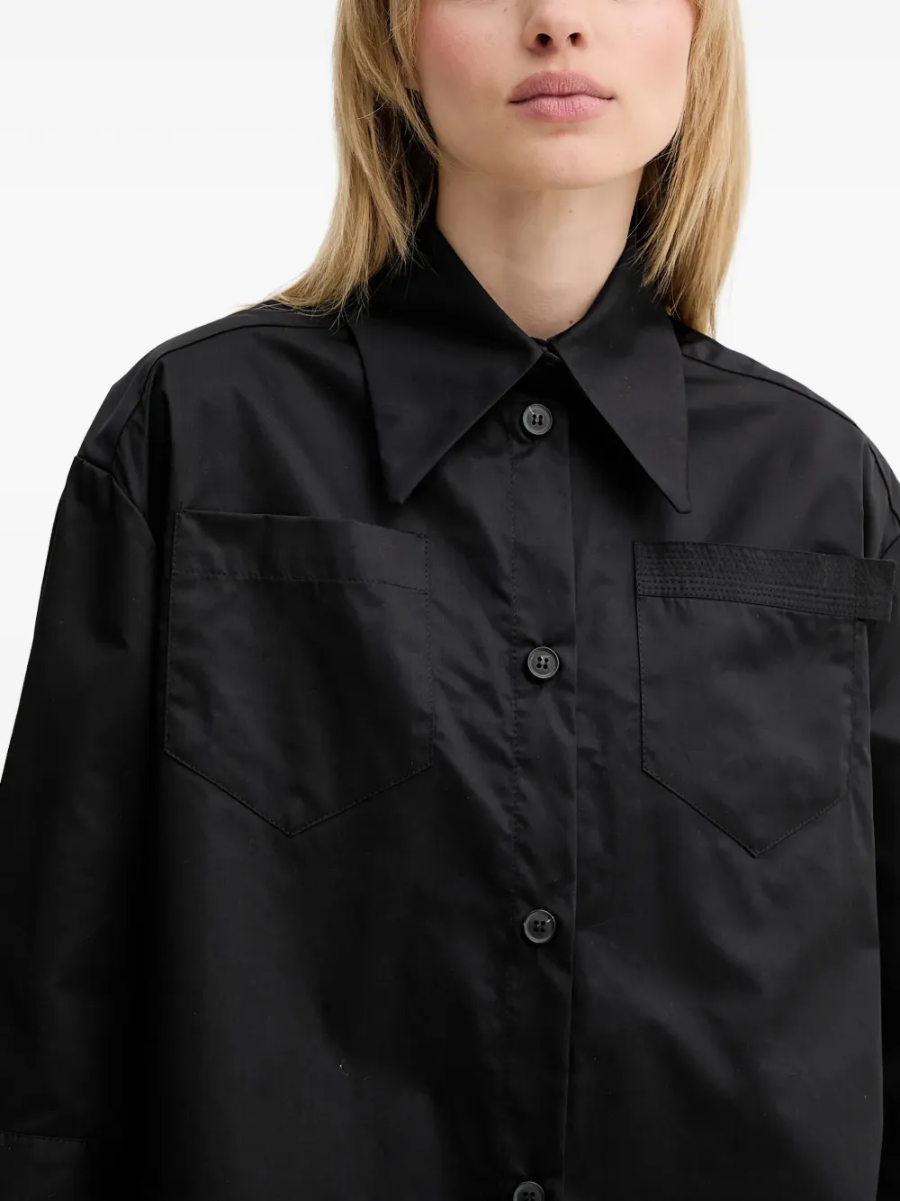Черный цвет, накладные карманы на груди, застежка на пуговицах, укороченные широкие рукава, заостренный воротник, прямой край