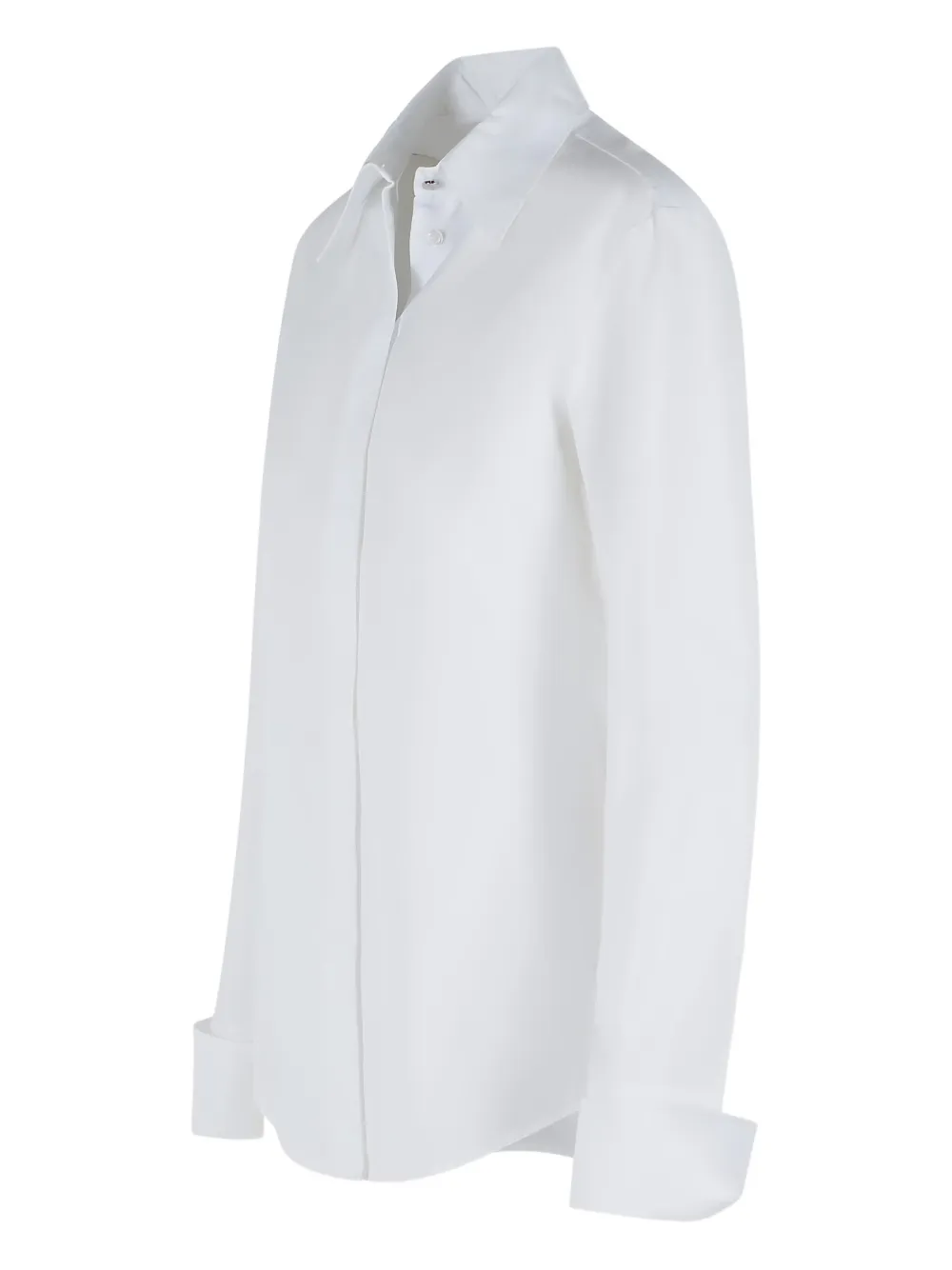 Белый цвет, потайная застежка на пуговицы, изогнутый подол