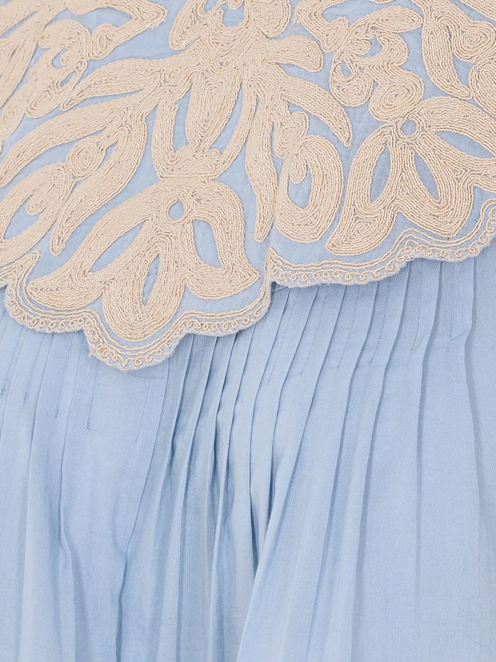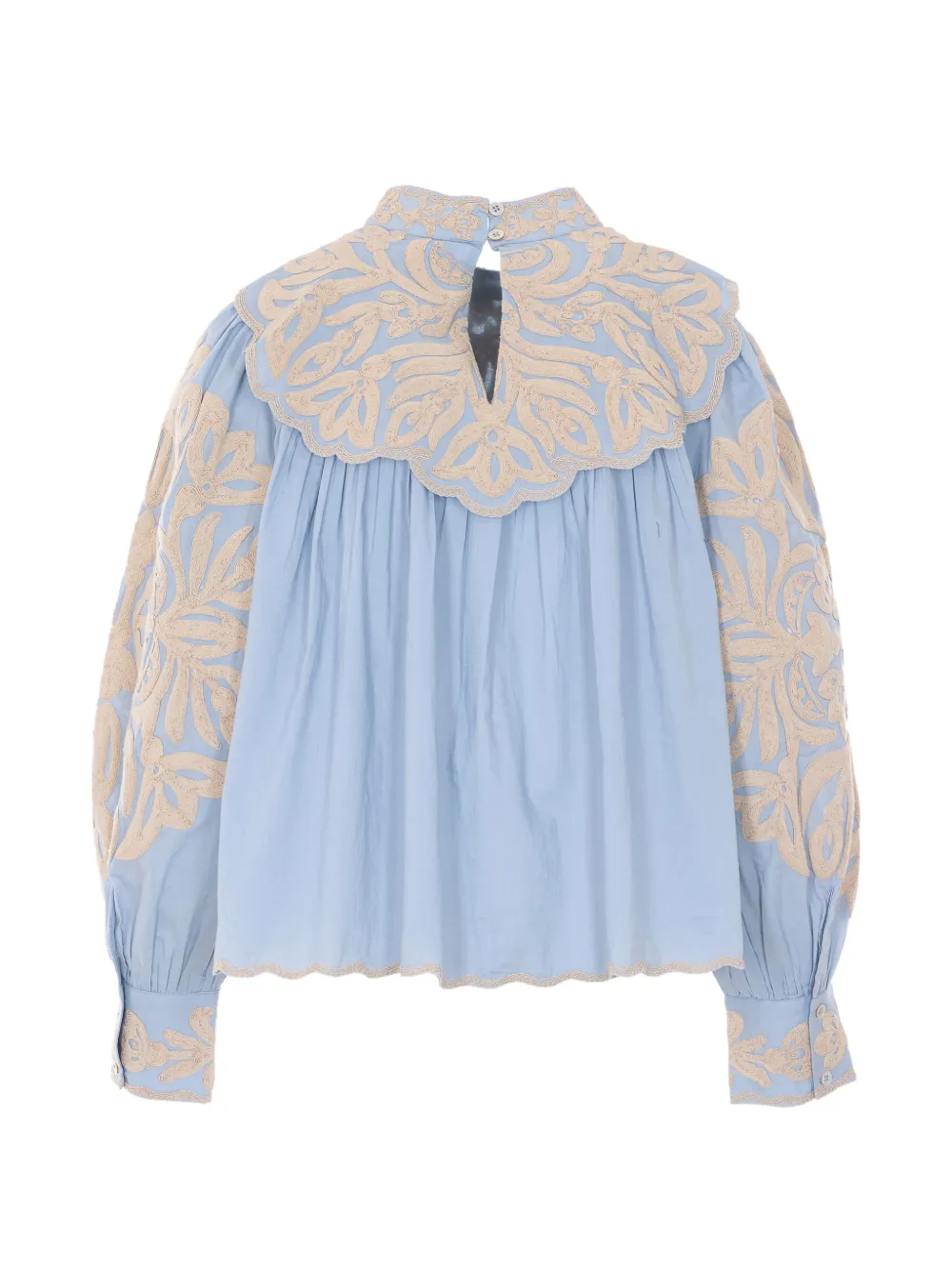 Светло-голубой, вышивка, пуговица сзади, длинные рукава, манжеты на пуговицах, высокий воротник