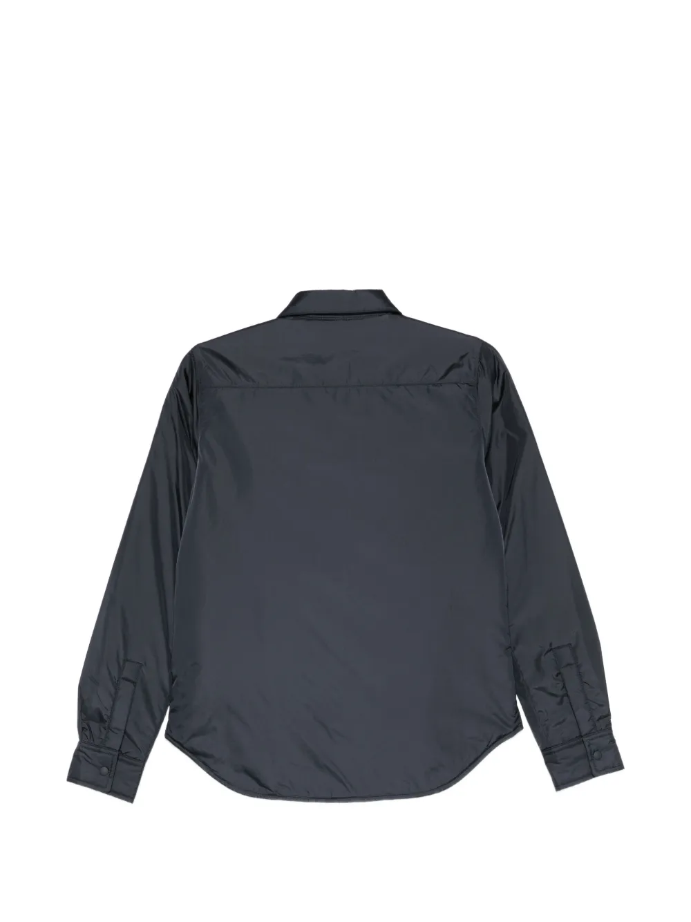 Темно-синего цвета, застегивается на пуговицы, воротник-пойнт, длинные рукава, манжеты на пуговицах, закругленный подол