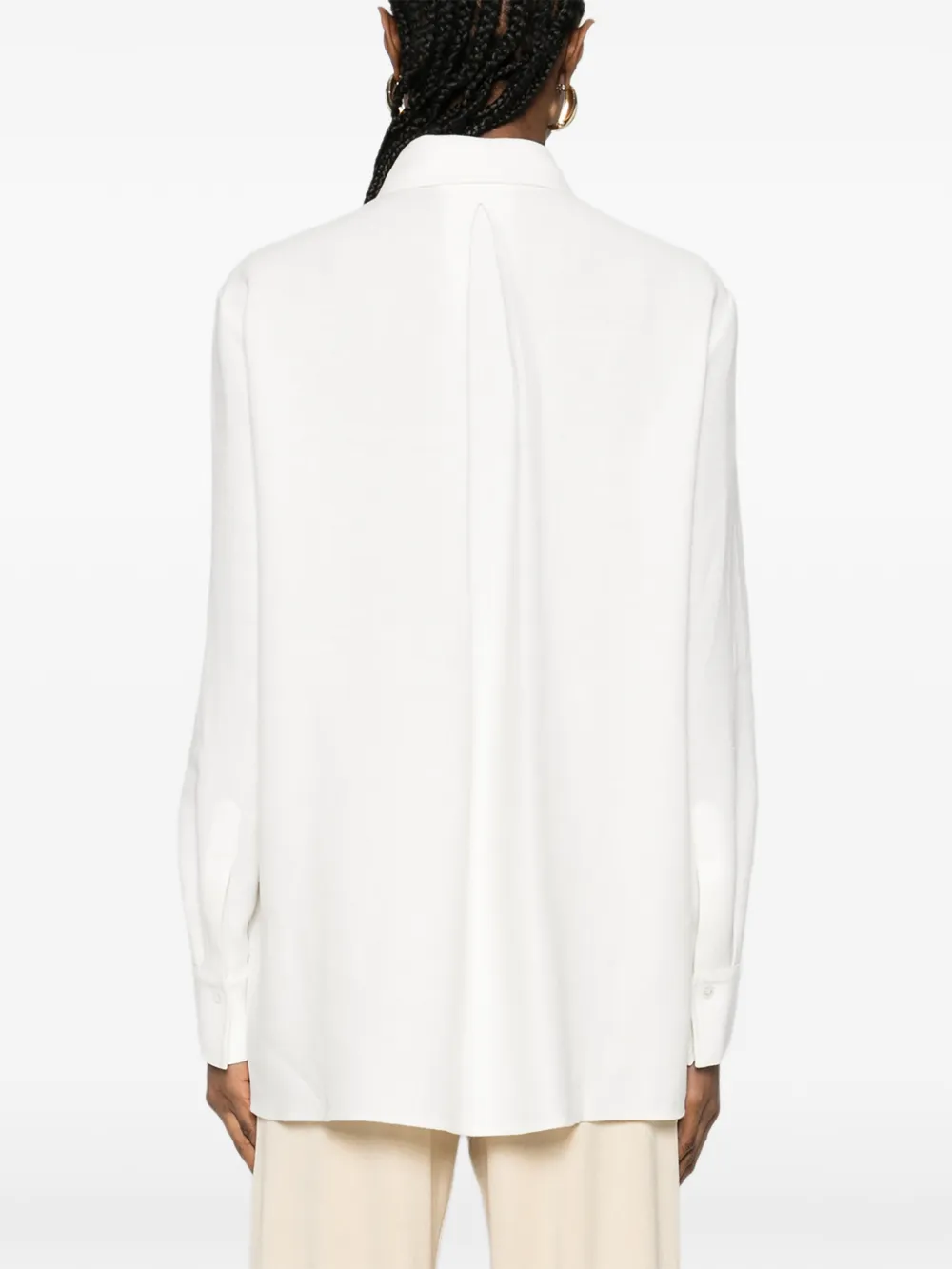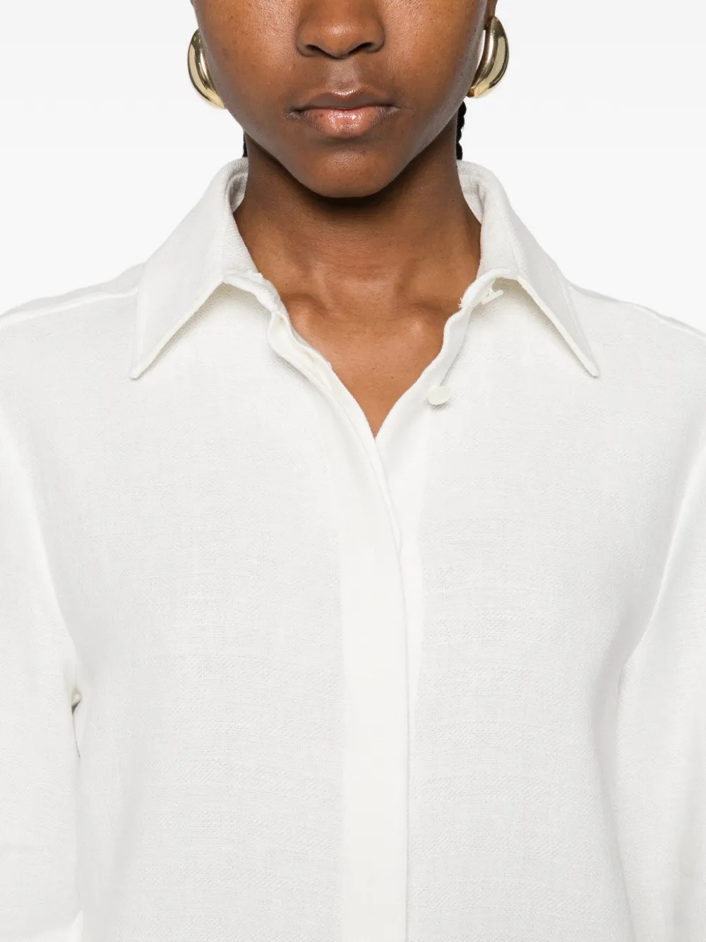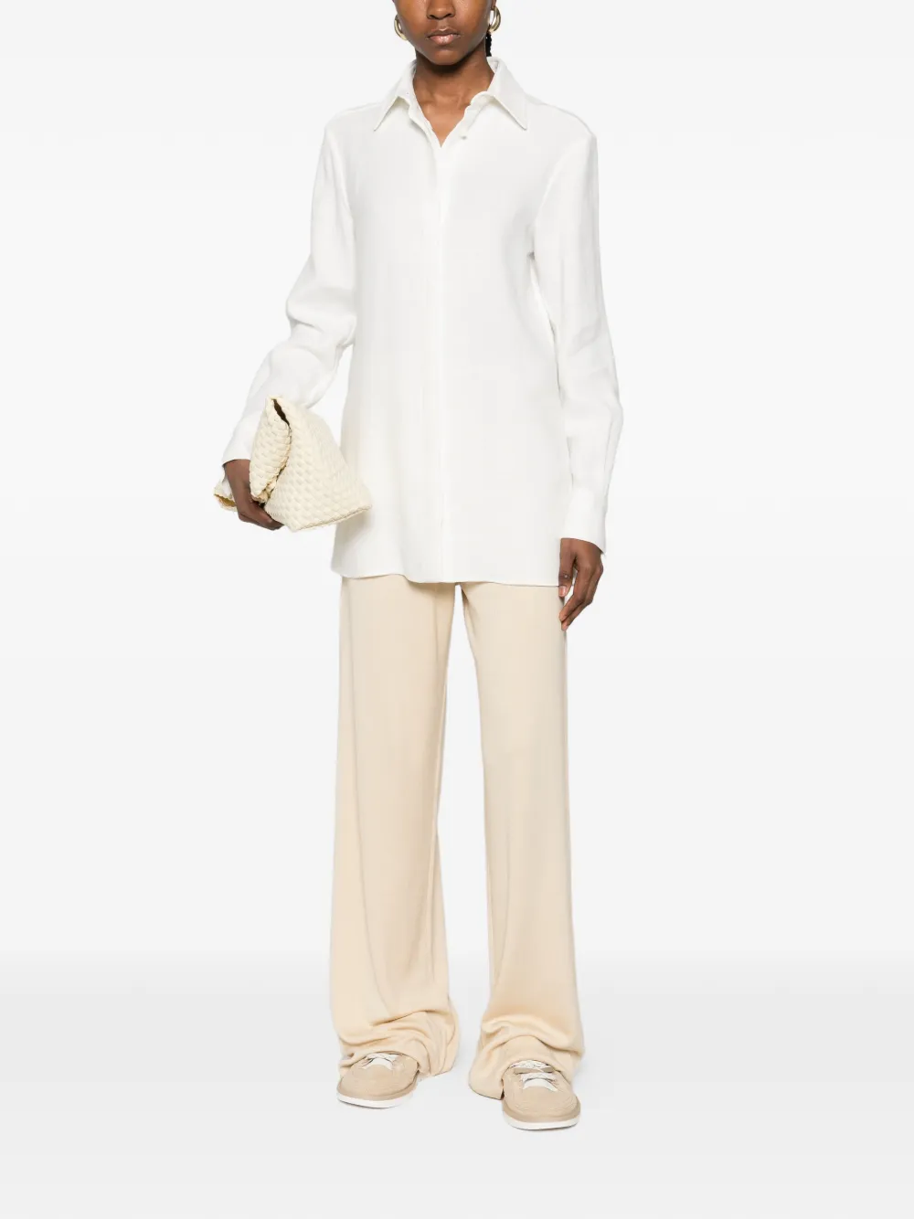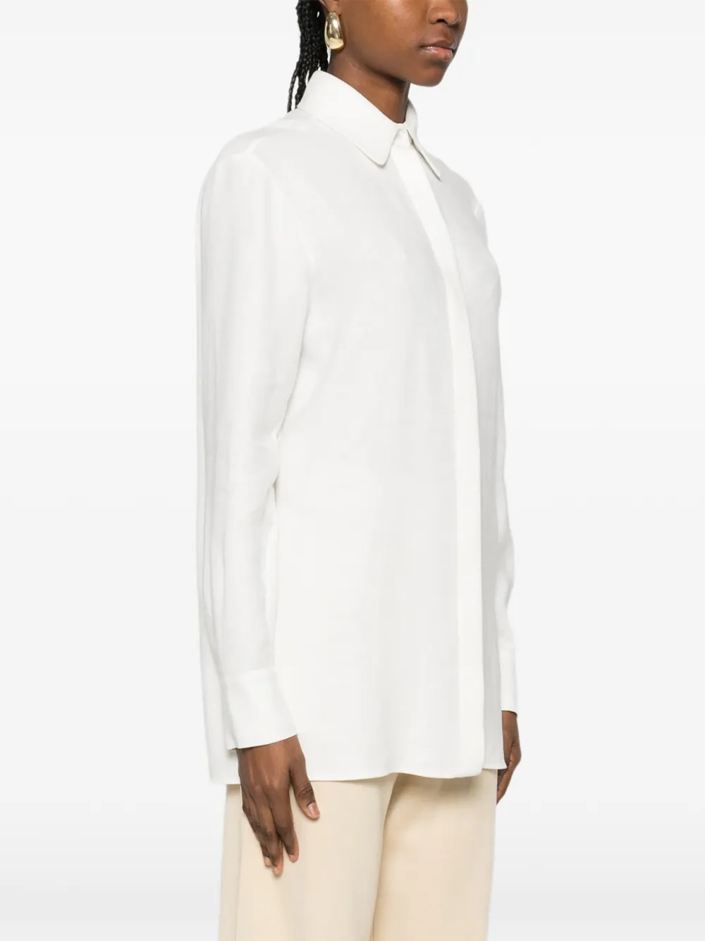 Белый цвет, длинные рукава, застежка на пуговицы, отложной воротник, манжеты на пуговицах