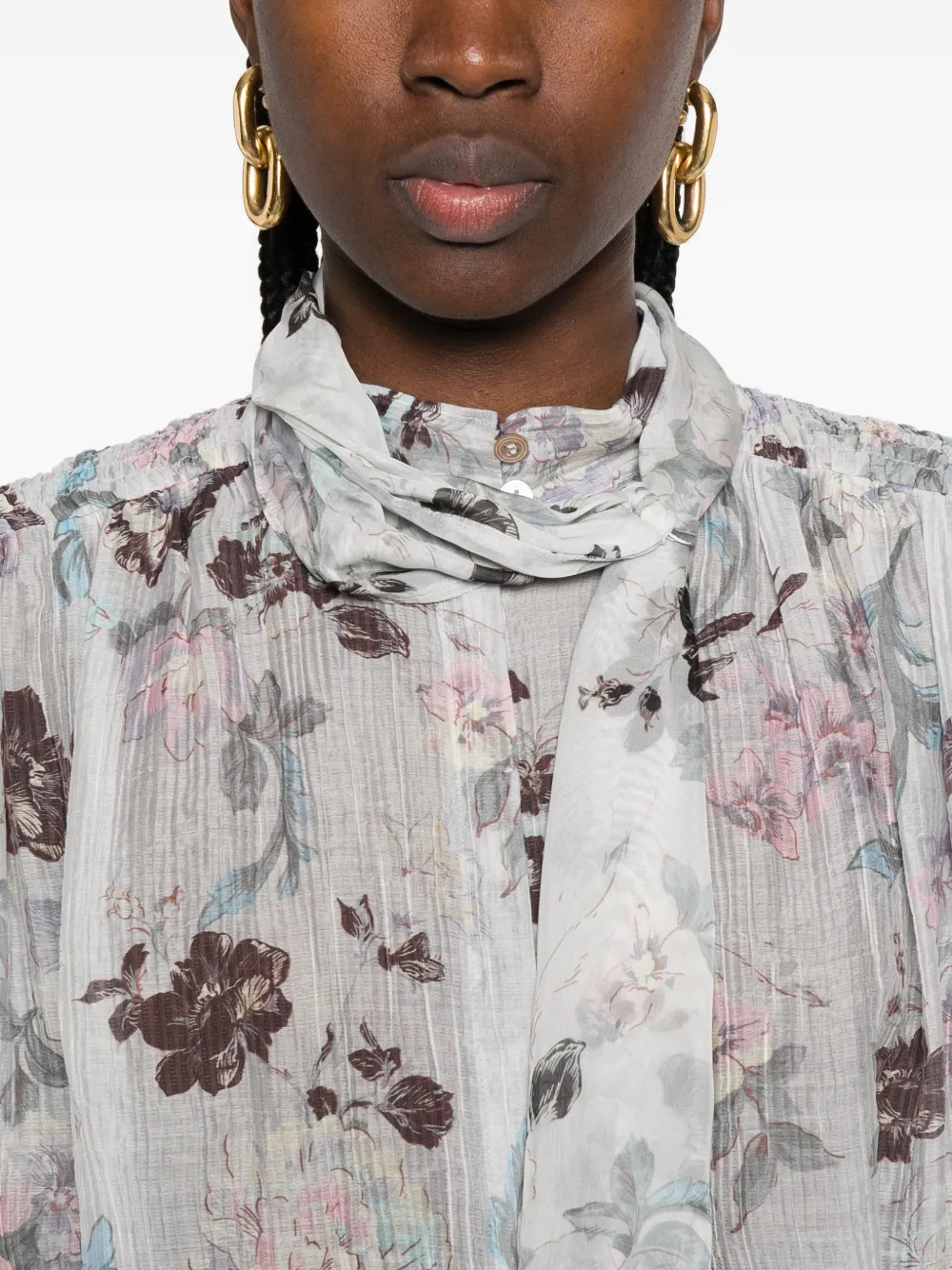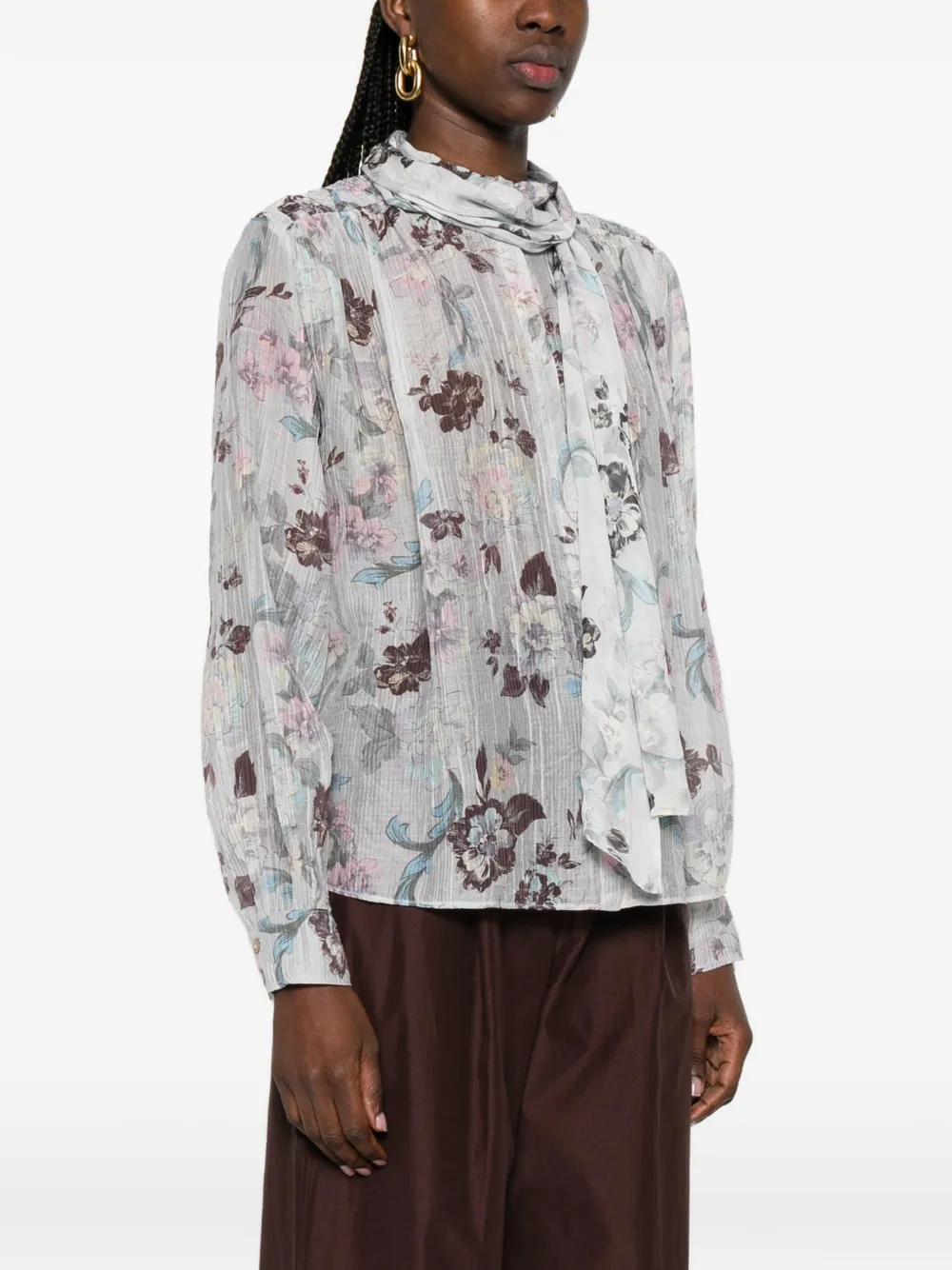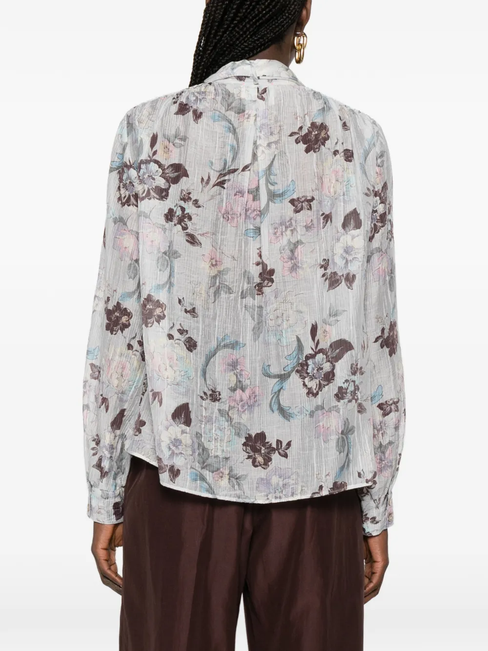 Глициния, цветочный принт, завязки, длинные рукава, манжеты на пуговицах, прозрачная