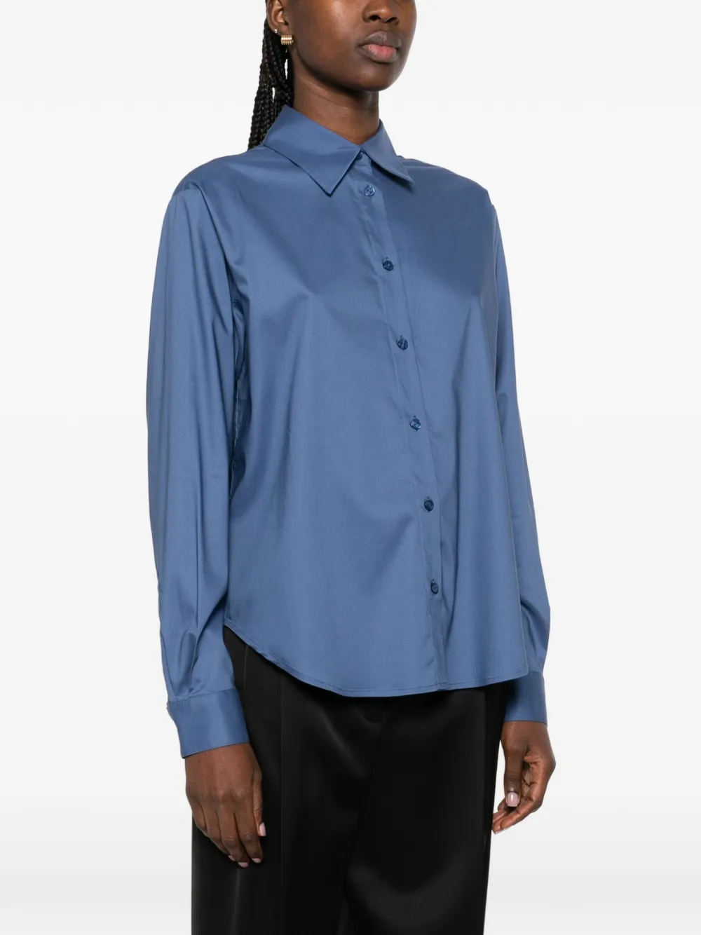 Выстиранный синий цвет, застежка на пуговицы спереди, воротник с острыми концами, длинные рукава, манжеты на пуговицах, закругленный подол