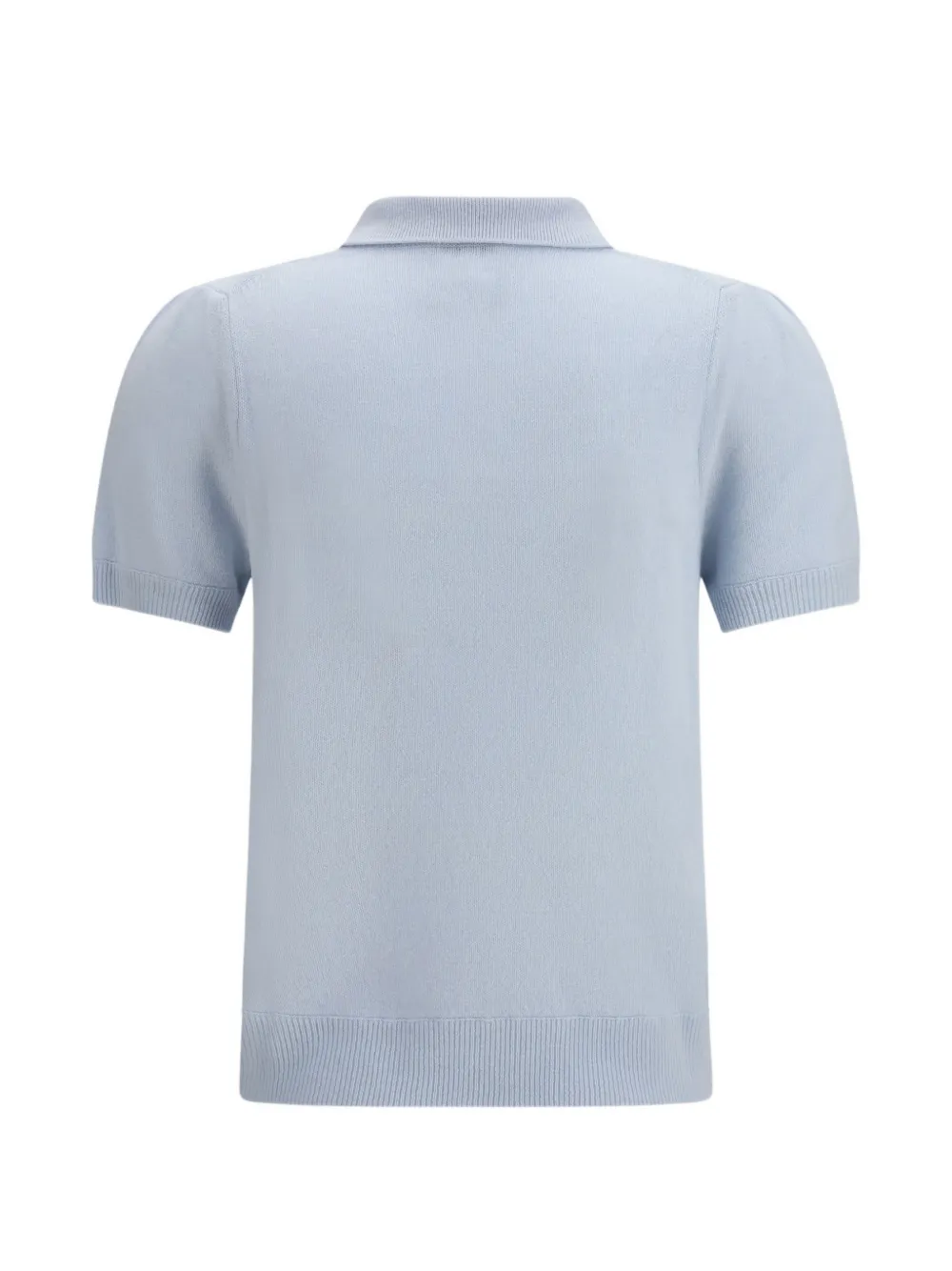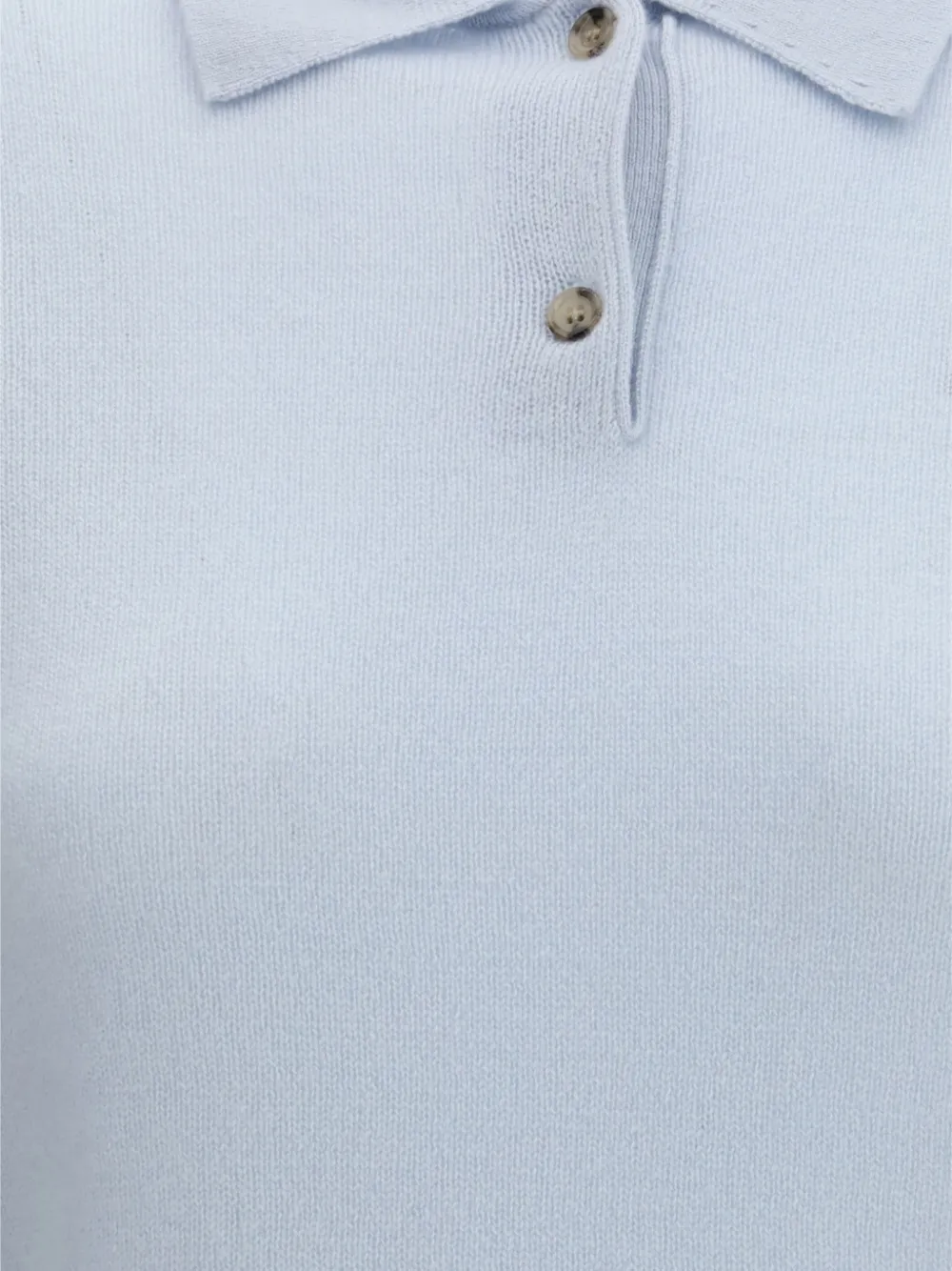 Светло-голубое кашемировое поло с застежкой на пуговицы, короткими рукавами, ребристым подолом, вязаной фактурой