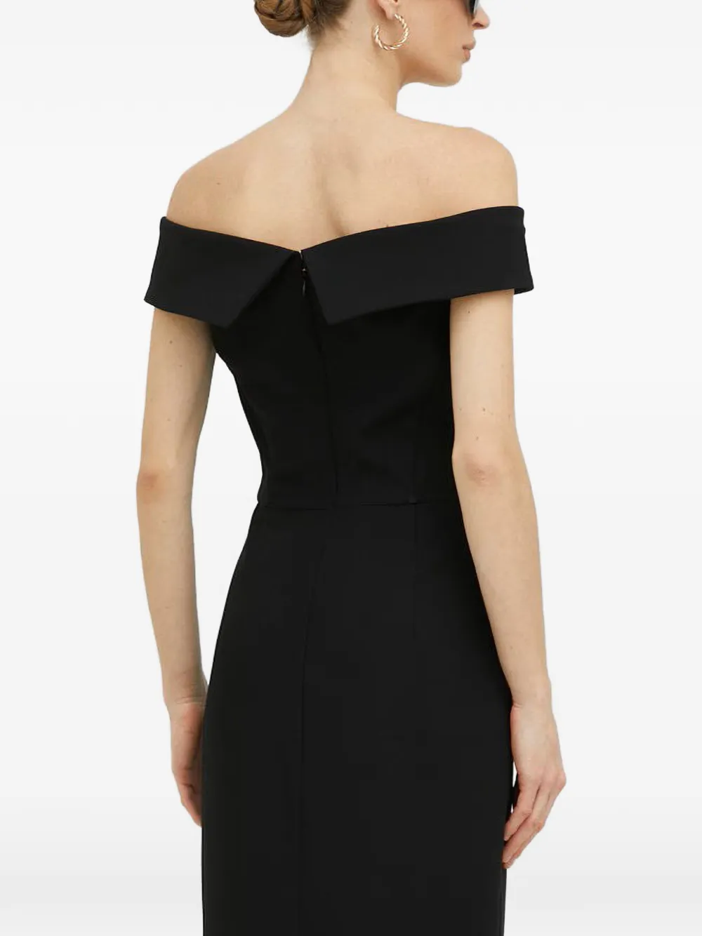 Черный дизайн с открытыми плечами, застежка-молния сзади, длина ниже колена, прямой край