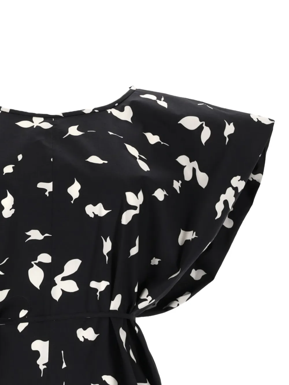 Черно-белый принт с листьями, пояс на талии, короткие широкие рукава, круглый вырез, прямой низ