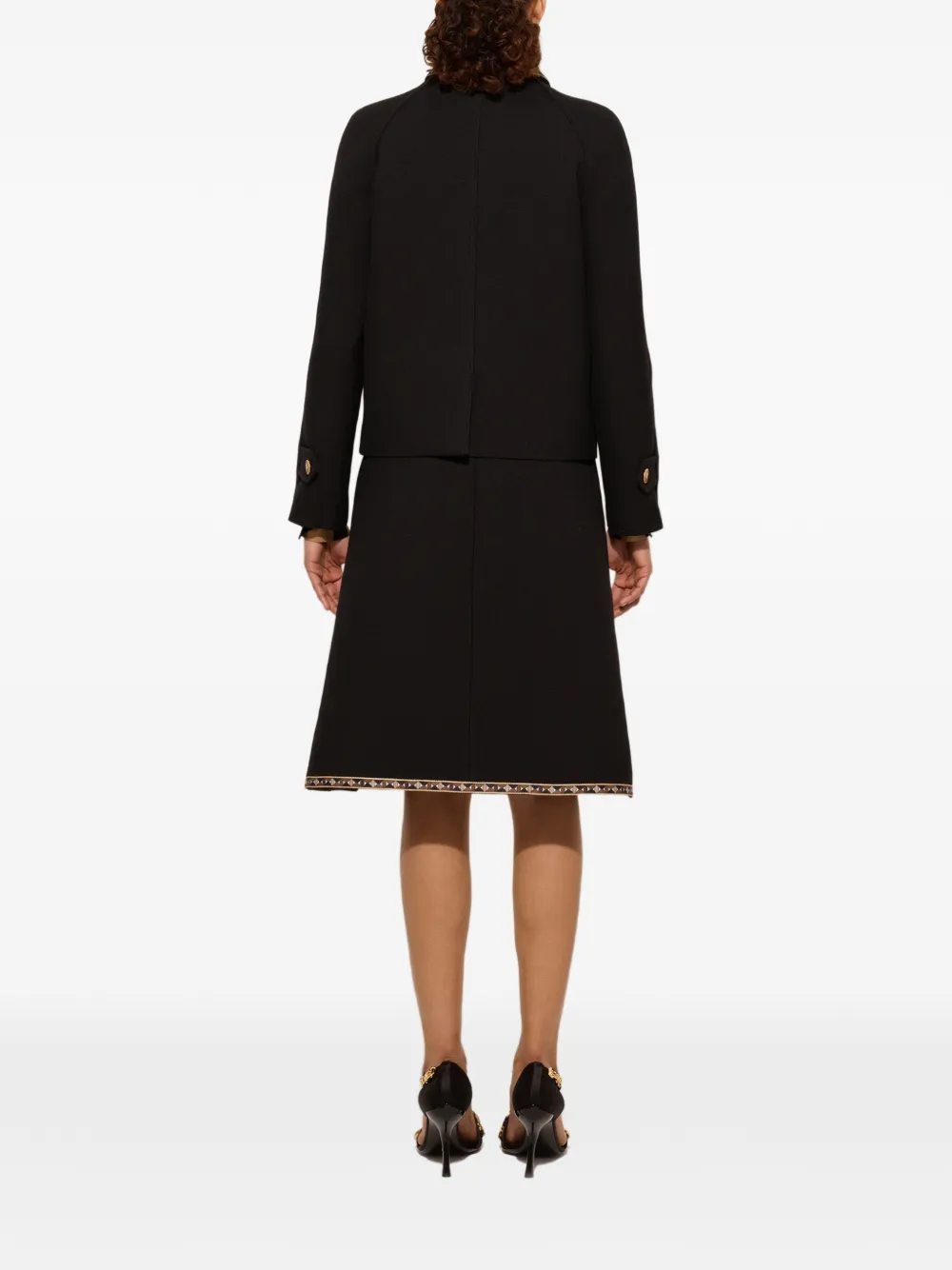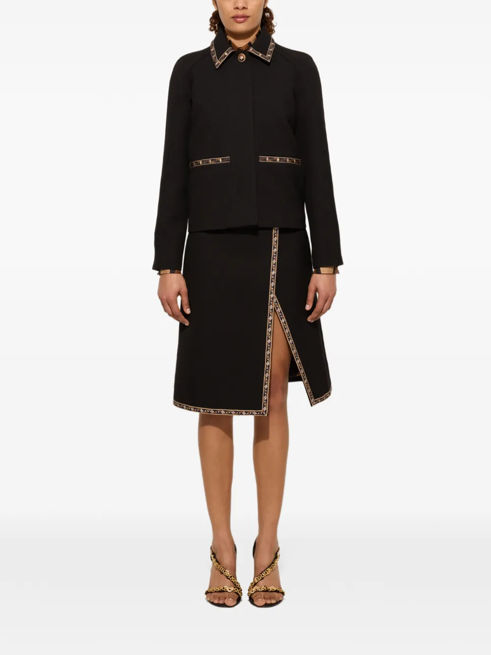 Черный с принтованными деталями, застежка на одну пуговицу, длинные рукава, отложной воротник