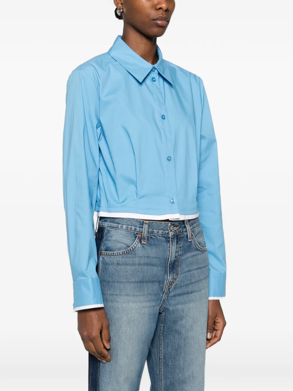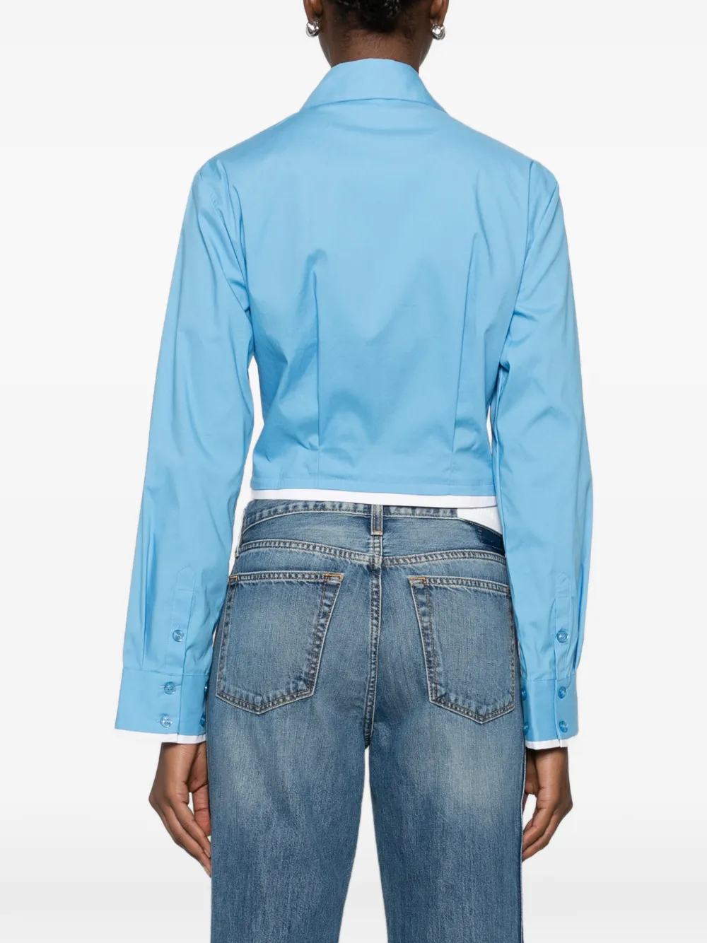 Синяя укороченная рубашка с застежкой на пуговицы, длинными рукавами, воротником и контрастной отделкой