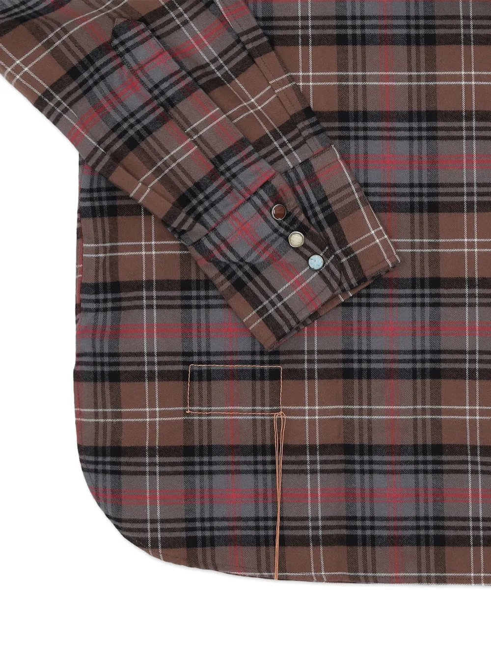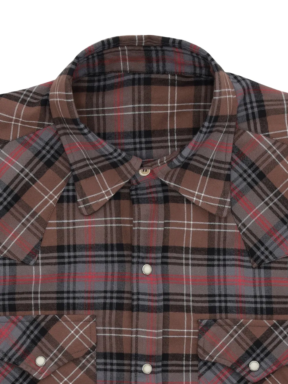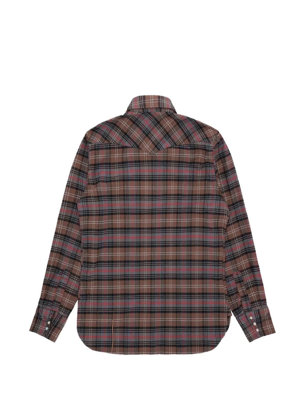 Коричневая рубашка в клетку, кокетки спереди и сзади, два накладных кармана спереди, детали с клапанами, кнопки