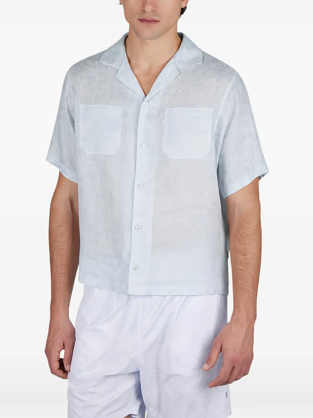 Светло-голубой с узором «пейсли», накладные карманы, застежка на пуговицы, короткие рукава