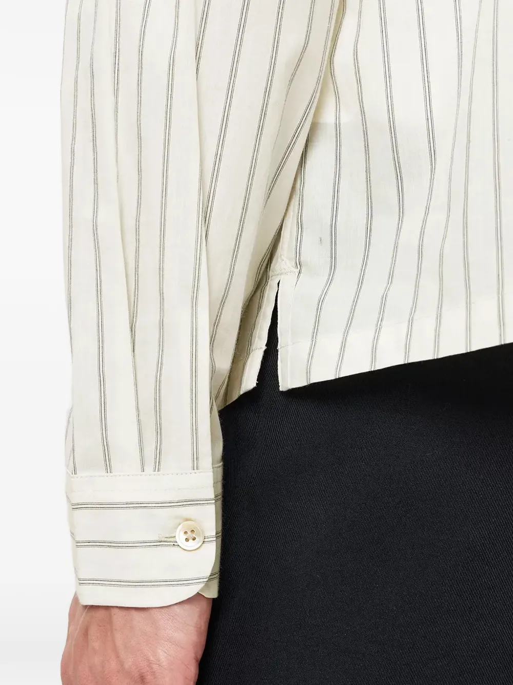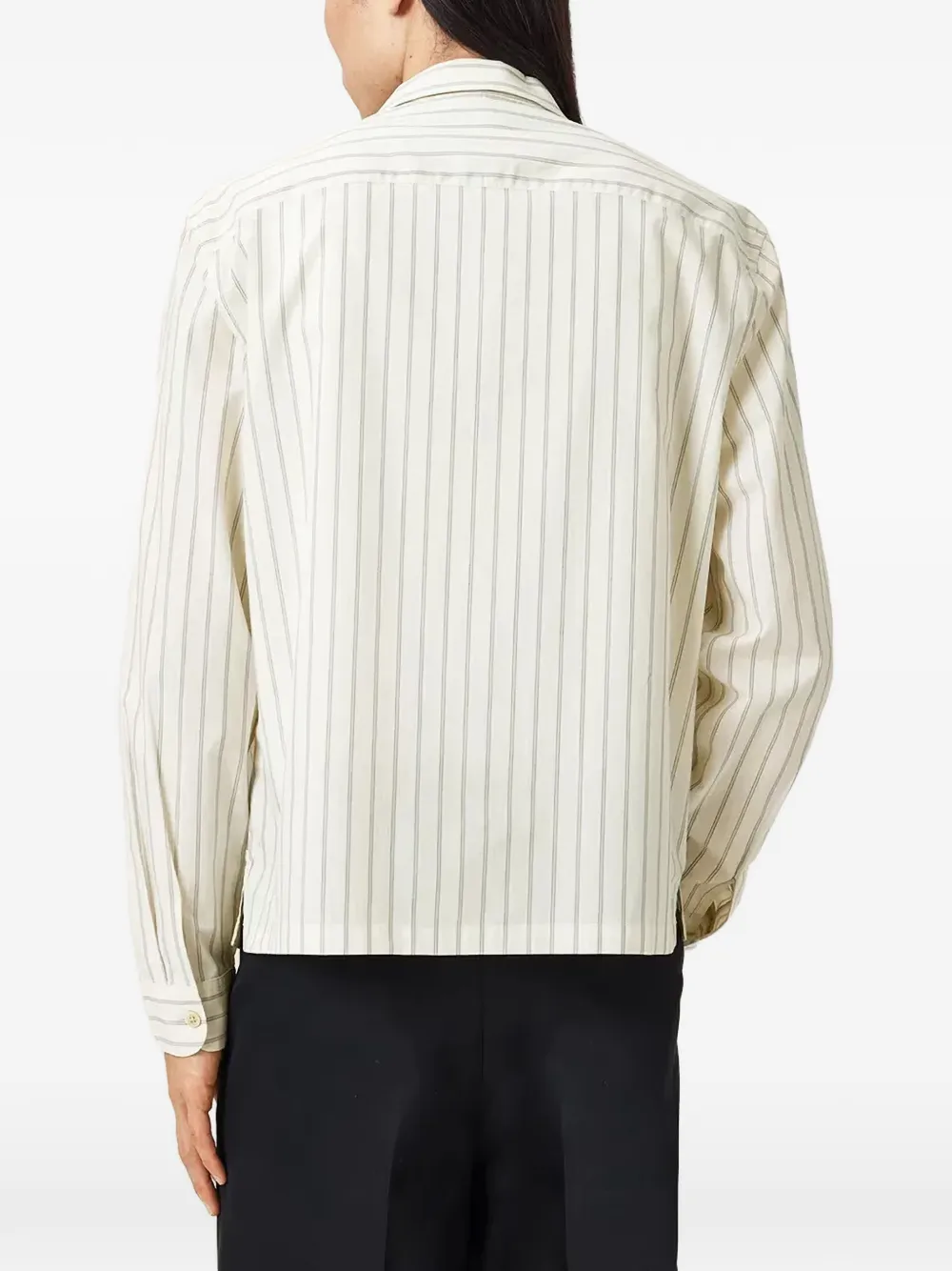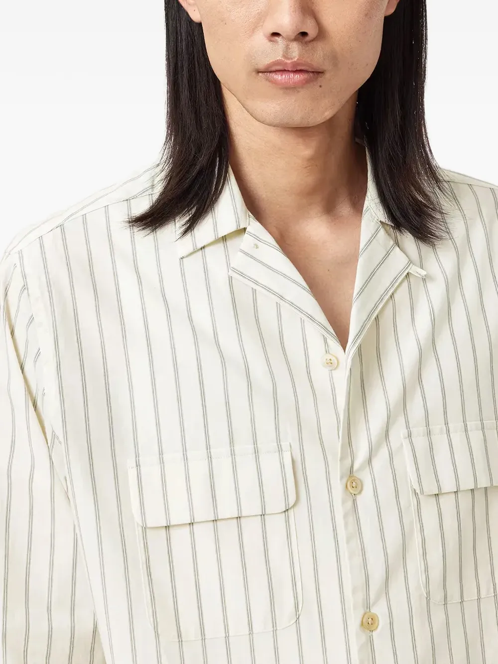Белый цвет, полосатый узор, нагрудные карманы, застежка на пуговицы, манжеты на пуговицах