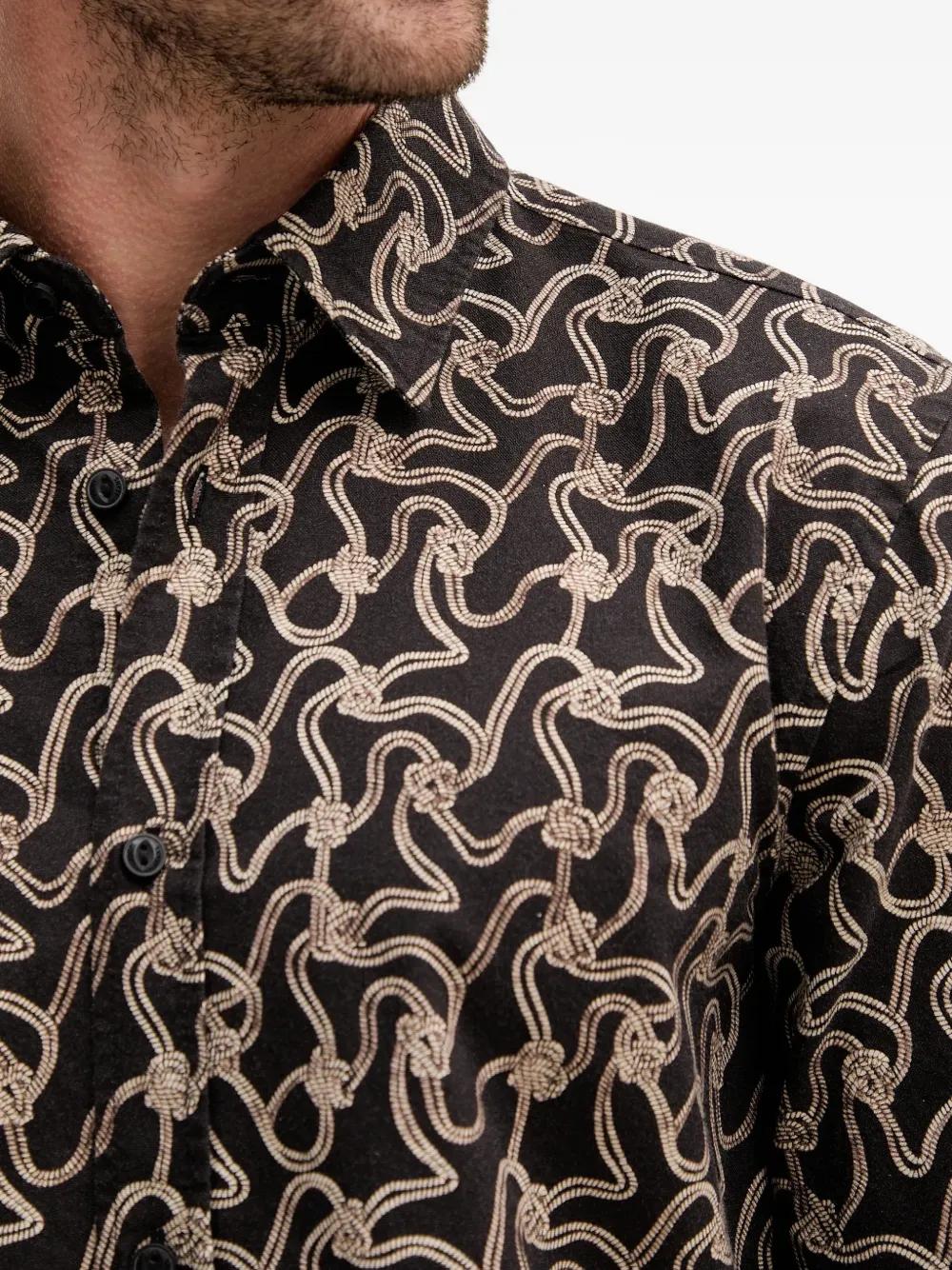 Черная рубашка с графичным узором, застежкой на пуговицы, длинными рукавами, манжетами на пуговицах и заостренным воротником