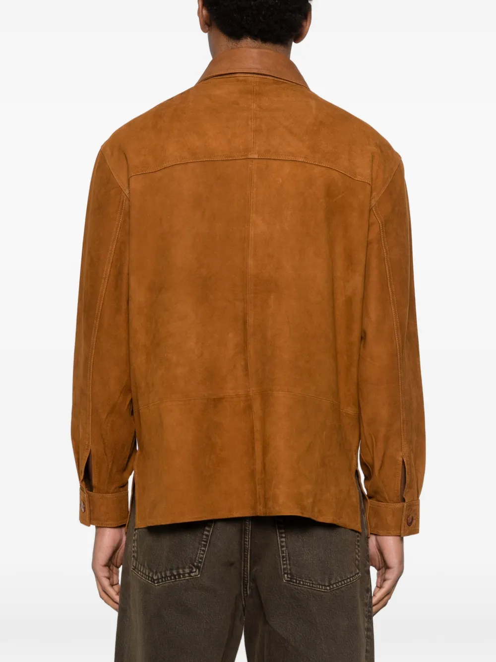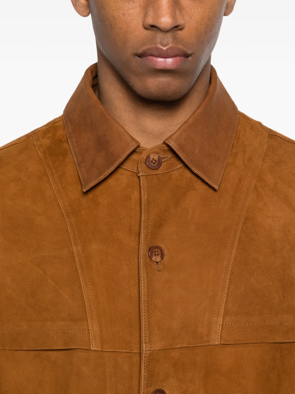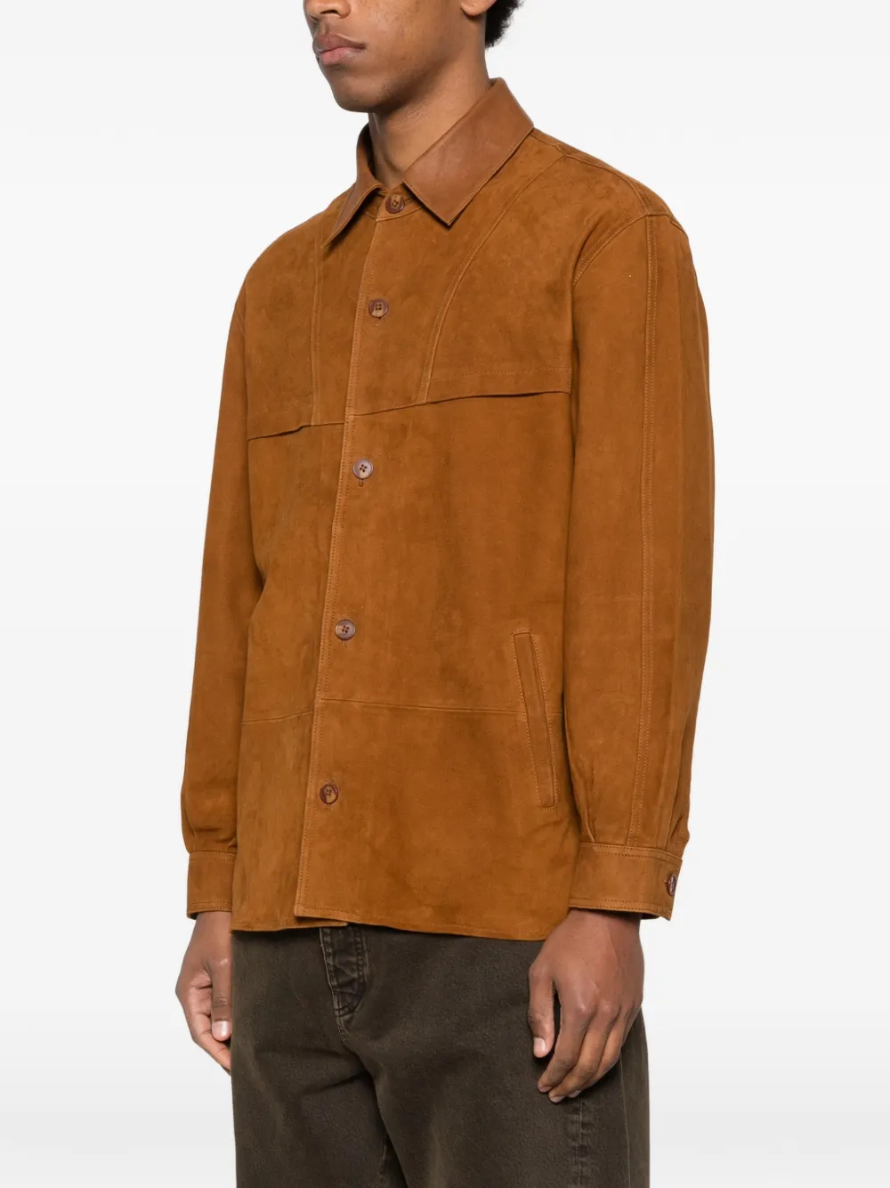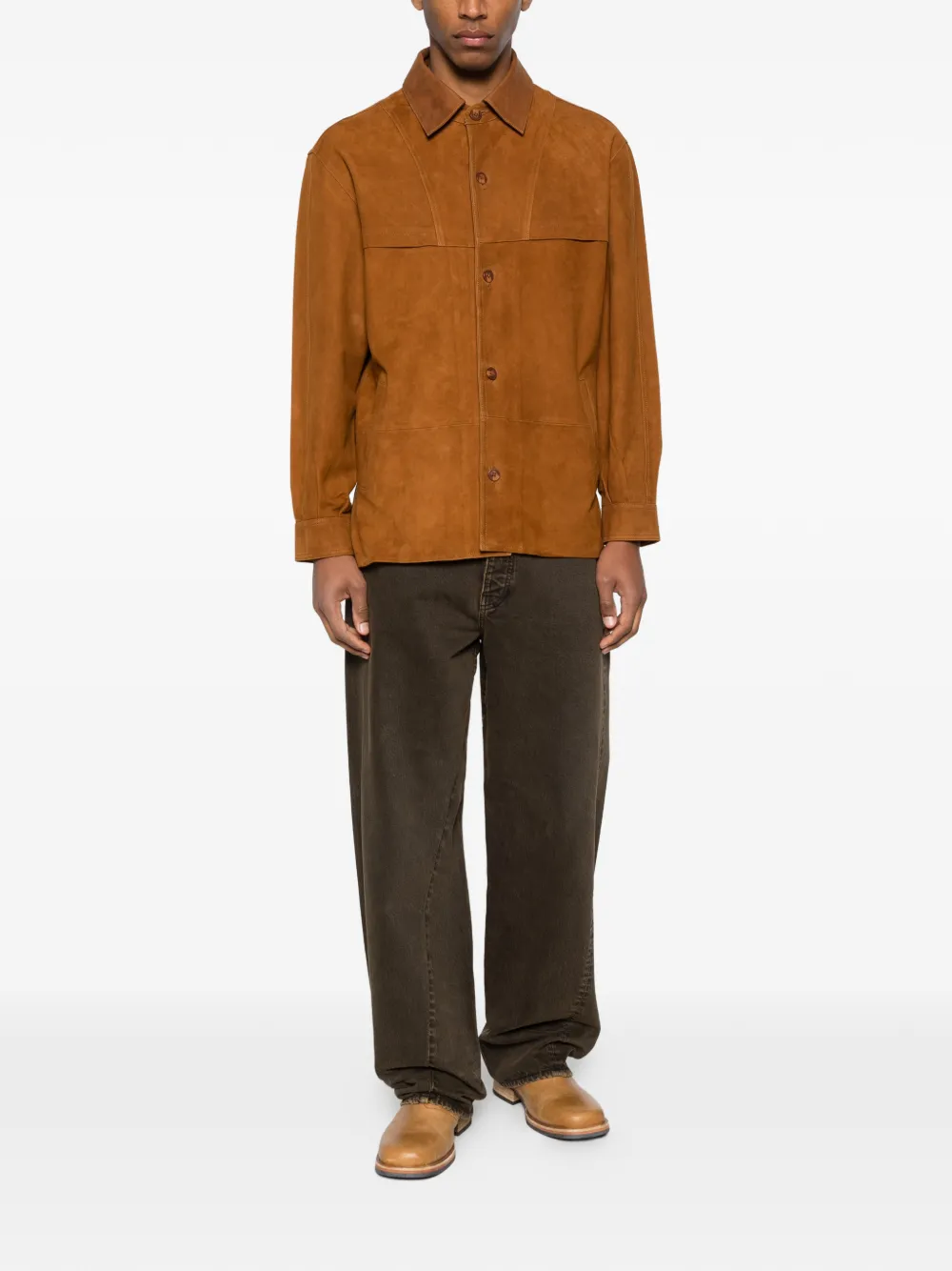 Коричневая рубашка с воротником, застежкой на пуговицы спереди, накладными карманами, длинными рукавами и комбинированной конструкцией