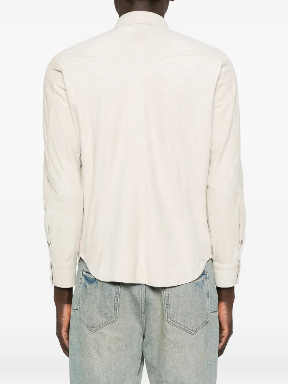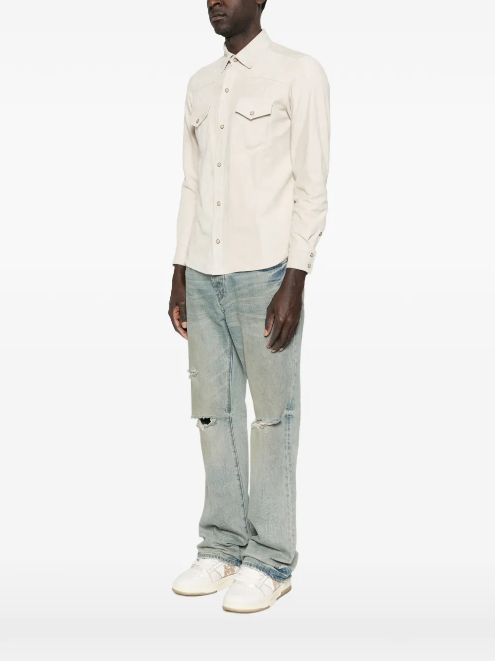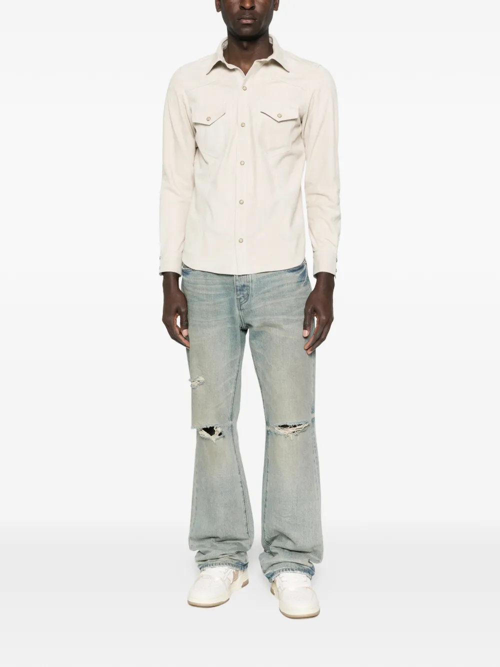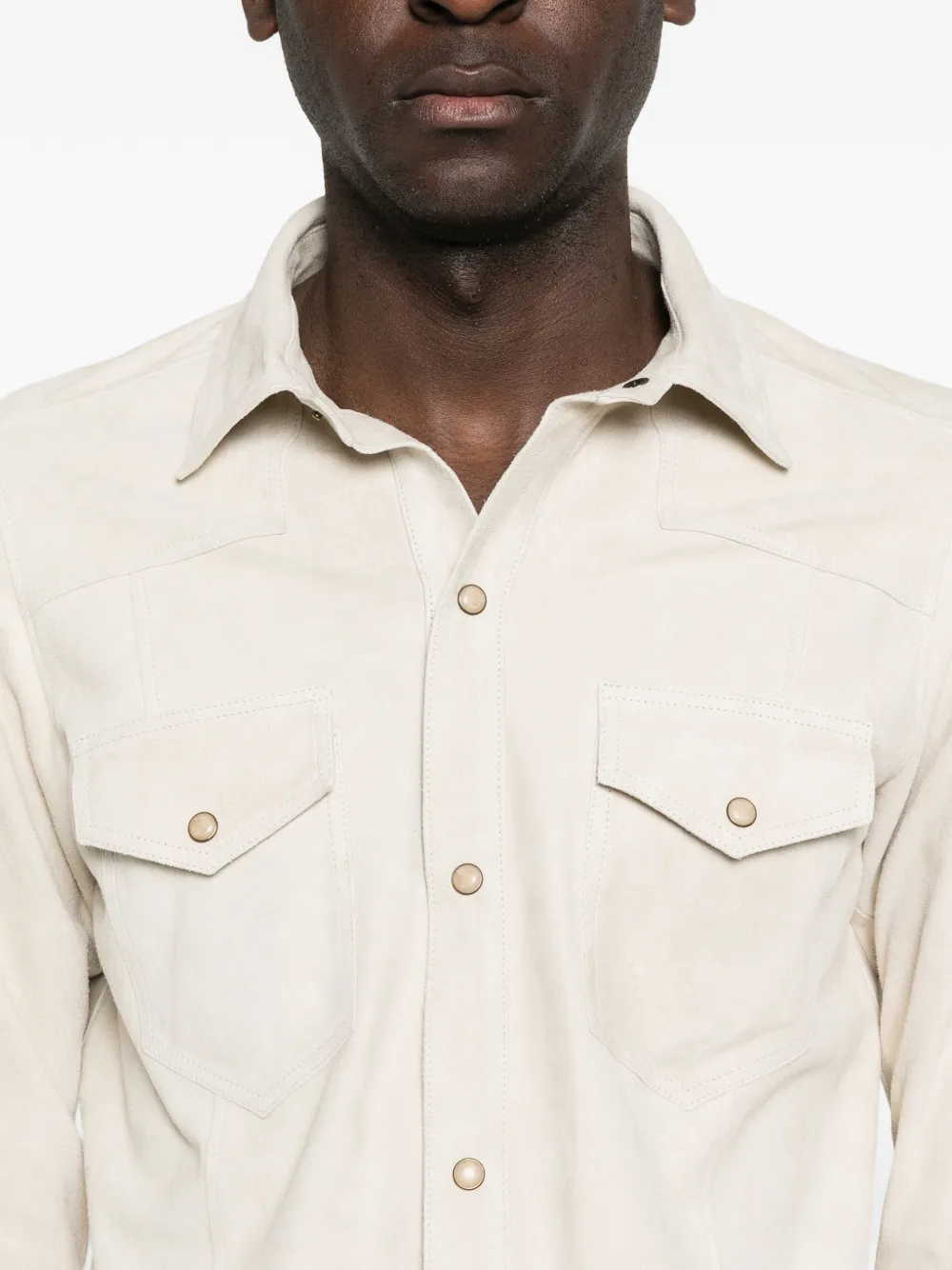 Светло-кремовый цвет, застежка на пуговицы, отложной воротник, длинные рукава, нагрудные карманы с клапанами, комбинированная конструкция