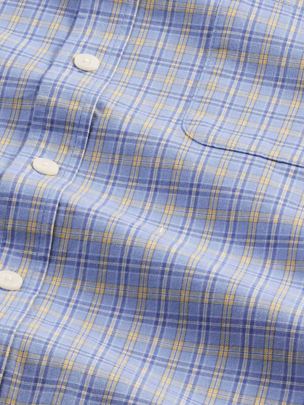 Синий в клетку, застегивается на пуговицы, длинные рукава, манжеты на пуговицах