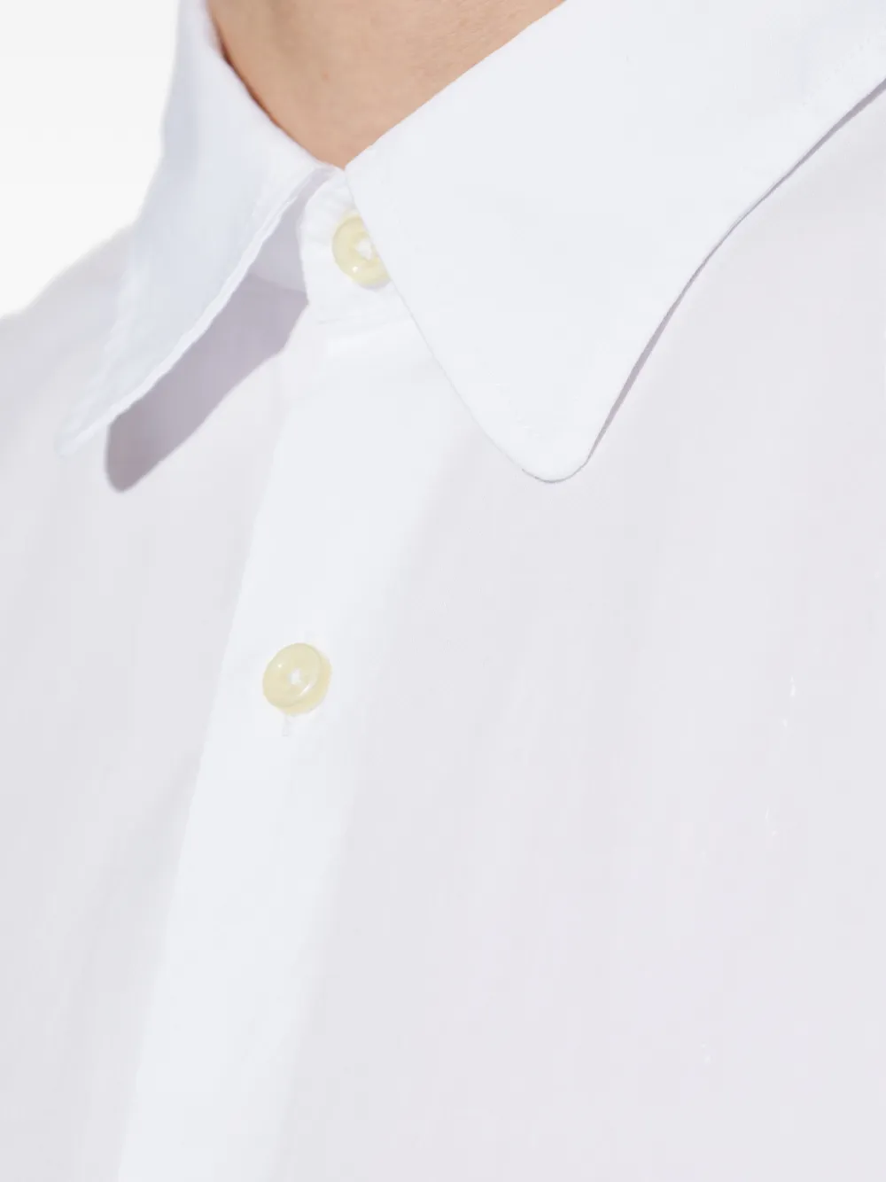 Белый цвет, застежка на пуговицы, длинные рукава, манжеты на пуговицах, классический воротник, закругленный подол