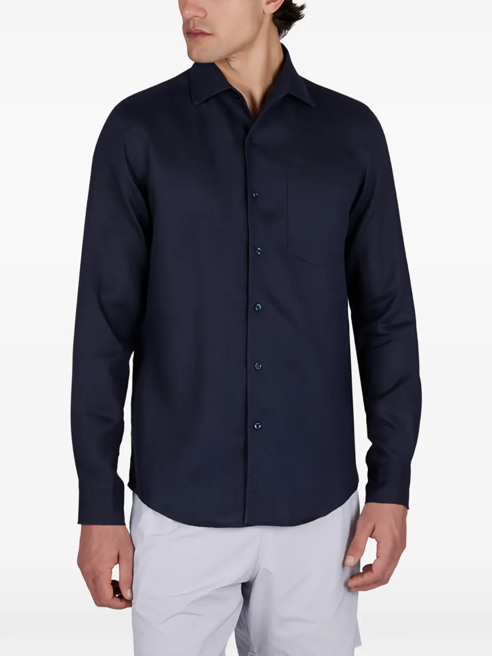Голубой цвет, нагрудный карман, застежка на пуговицы, длинные рукава, манжеты на пуговицах
