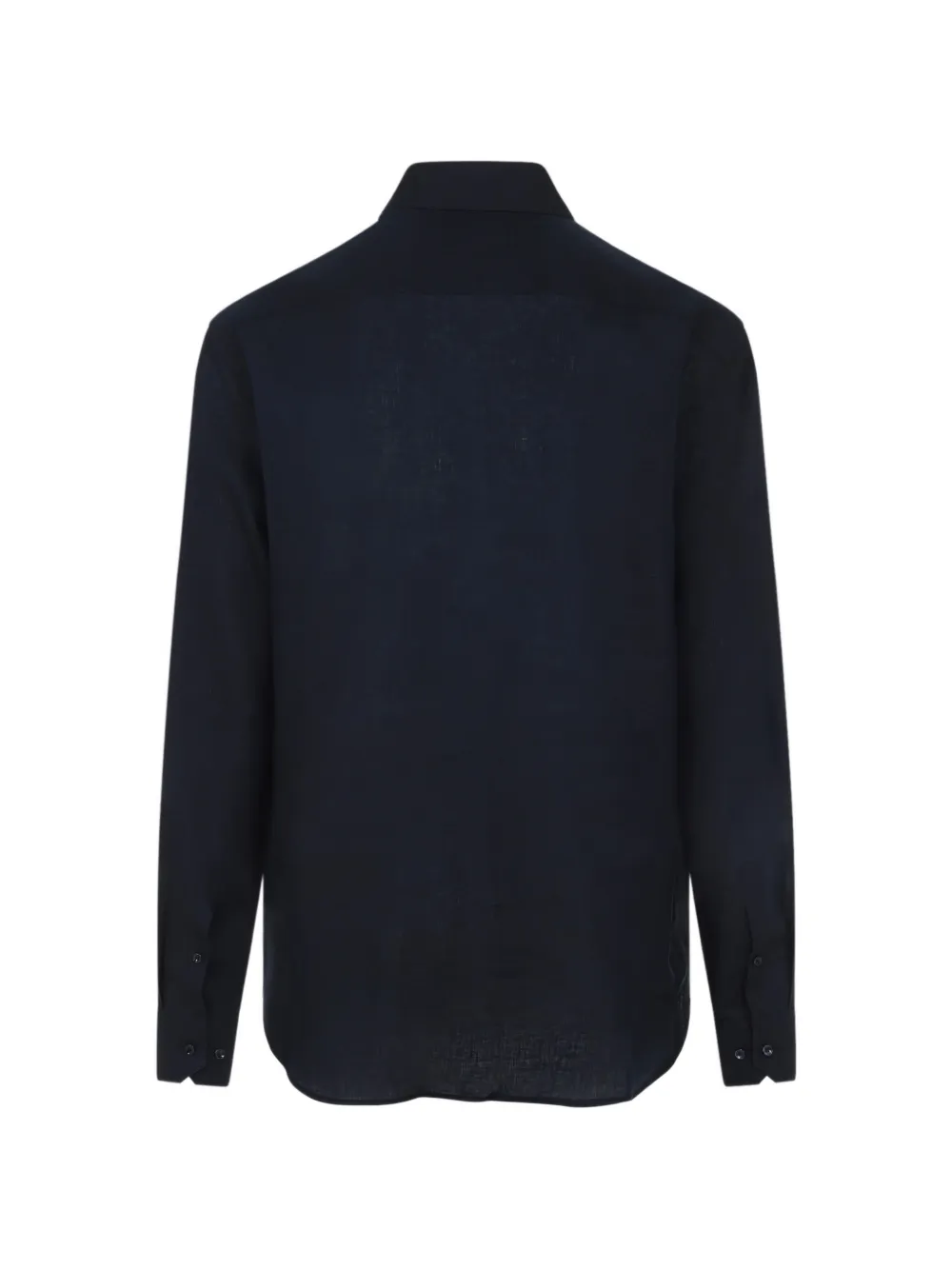 Синий лен, застегивается на пуговицы, длинные рукава, манжеты на пуговицах, воротник с отложным концом